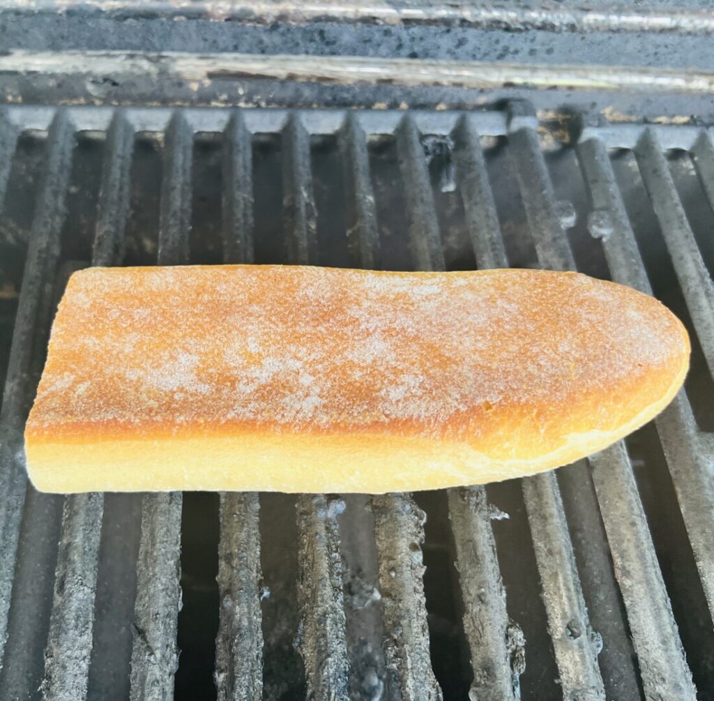 Once the grill is hot, use it to crisp the baguette. Place it on the grids and occasionally roll it a quarter turn until the exterior becomes crusty and may acquire light grill marks. Set it aside to cool.