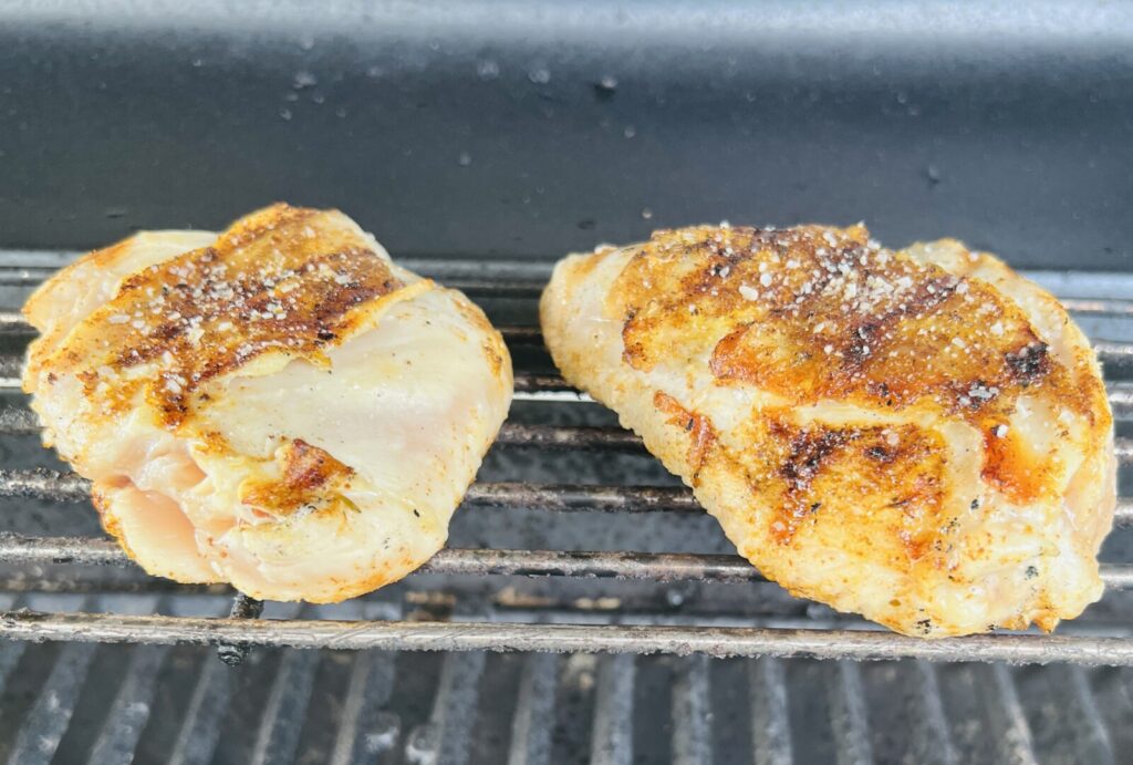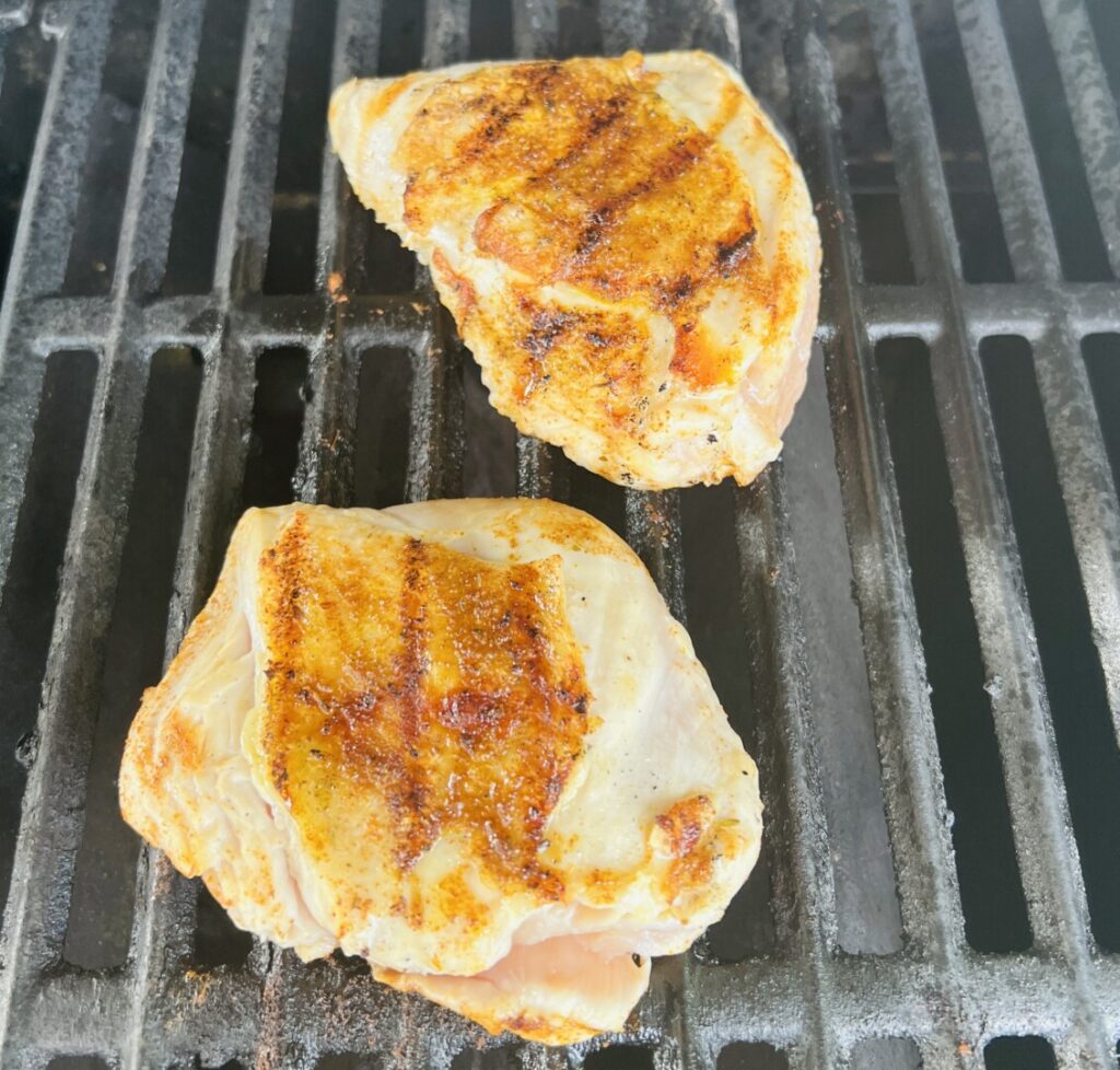 - Squeeze half of the oil onto the skin side of the chicken breast and then place it, skin-side-down, on the grill grids. Grill undisturbed for about 3 minutes until grid lines form and the skin browns enough to release from the grids.