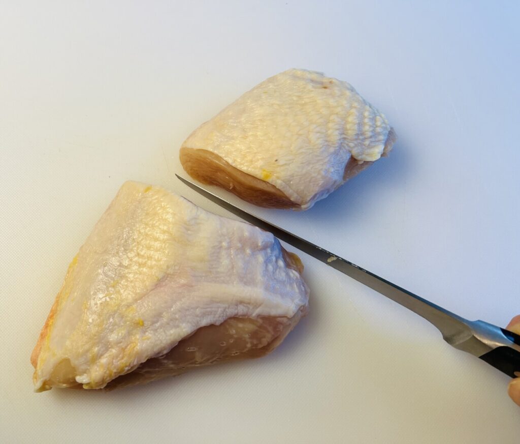 Once you’ve boned out a chicken breast, you’ll notice that it’s thicker and wider at one end, and thinner and narrower at the other. So, to make two portions of equal weight, you can’t just cut it in half. Make the cut so that, looking down at the top of the chicken breast, the thick/wide end appears smaller and the thin/narrow end larger.