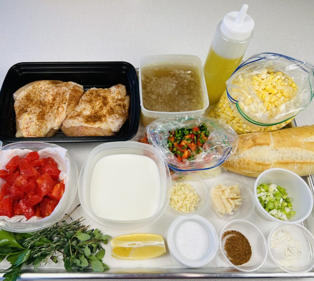 One of the most interesting recipes of Cajun cuisine is the corn-based side dish known Maque Choux. The name literally translates to “Mock Cabbage.” The reason for this name is obscure, but some food historians believe that the recipe originally was for cabbage but, in Louisiana, its main ingredient changed to sweet corn. (Inspired by this explanation, in winter months I’ve made the recipe substituting cabbage, and it’s pretty good.) Maque Choux traditionally is served as a side dish, but it can be transformed into a one-pan entrée by adding diced chicken, diced ham, or shrimp. This recipe presents Maque Choux as a bed for spice-rubbed grilled chicken breasts.