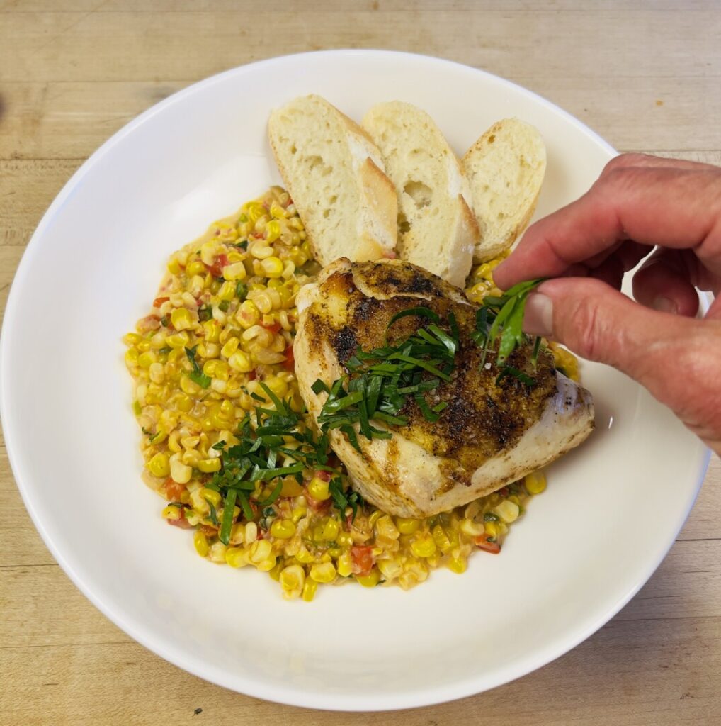 The last-minute finishing of this dish involves balancing flavors. Stir in the tomatoes and taste. Another layer of flavor. The natural sweetness of the corn combined with sweetness from caramelization typically needs acidity, here in the form of lemon juice. More flavor. Additional acid usually requires salt; add more if necessary. Finally, stir in the herbs and any juices formed around the resting chicken. Yet more flavor. The final consistency of your maque choux sauce should be thick enough to bind the corn kernels together but loose enough to flow on the plate. If it’s too thick, thin it with a little water.