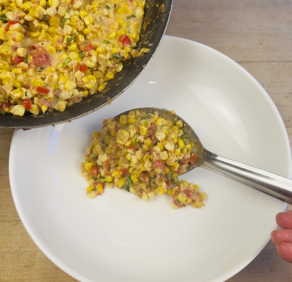 To finish the maque choux, add the scallions and half-and-half, and bring to the simmer. Cook, stirring, until the half-and-half reduces/thickens into a creamy sauce. The scallions add another layer of flavor, whereas the half-and-half enables more reduction. Evaluate the moisture content of your tomatoes and adjust the sauce consistency accordingly: If they’re very juicy, reduce until the sauce is slightly over-thickened.