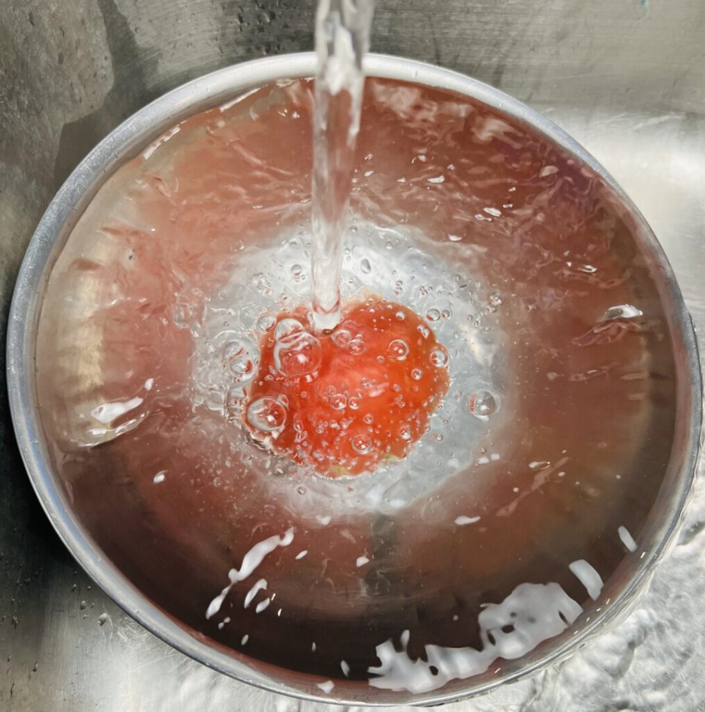 - Transfer the tomato to the bowl and refresh under cold running water for about 1 minute.