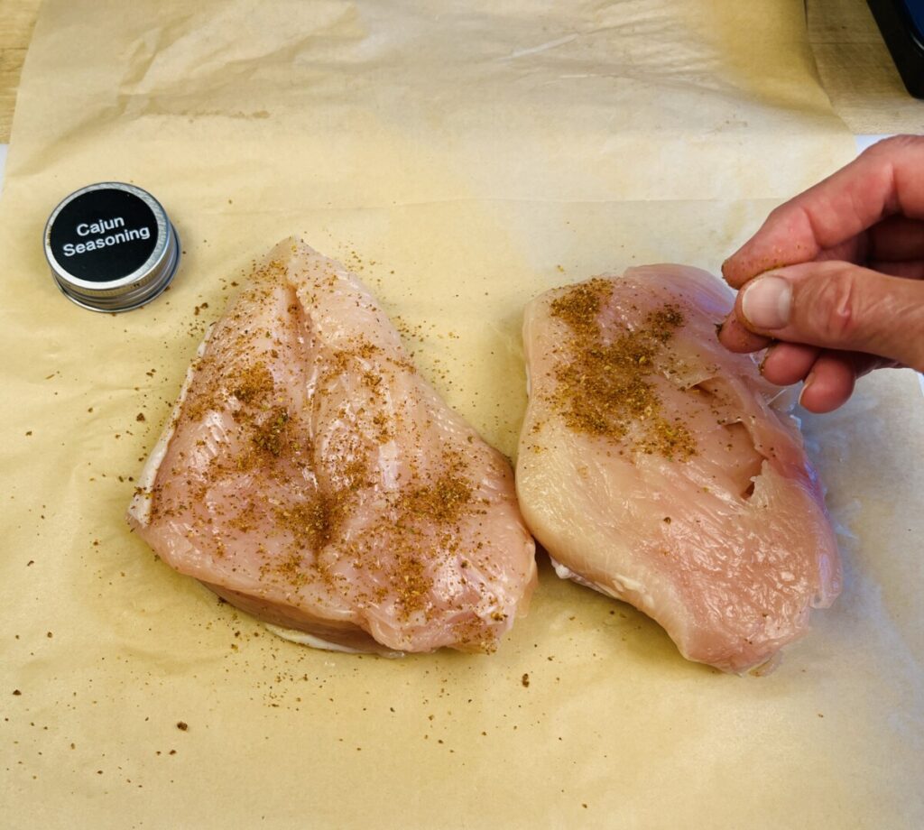 - Place the chicken pieces in a container skin-side up and sprinkle the skin sides with the remaining Cajun seasoning.