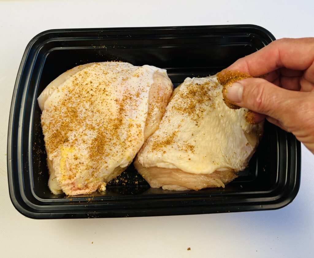 Finally, sprinkle both the flesh side and the skin side with Cajun seasoning. and massage it in. If time allows, let the seasoning rub permeate into the chicken for 24 hour up to 3 days.