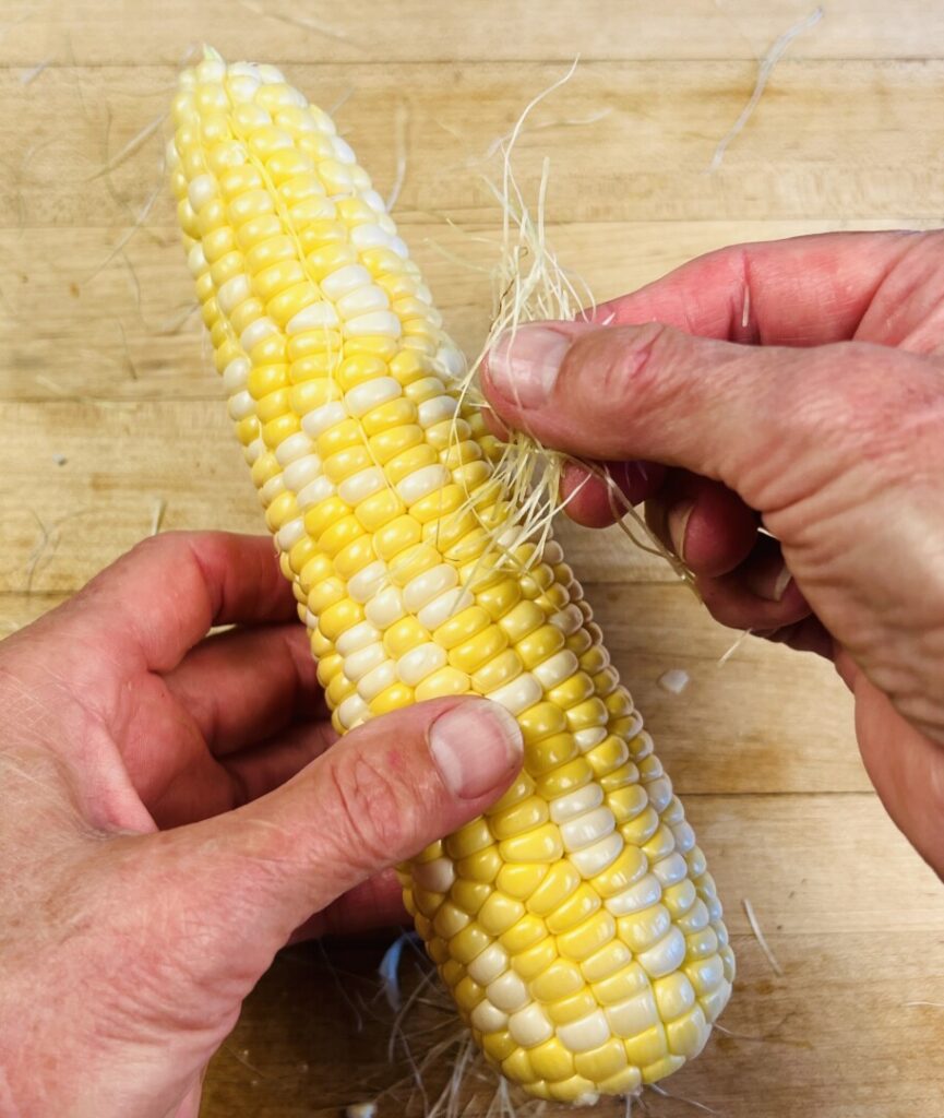 - Use your fingers and/or a vegetable brush to remove the silk clinging to the kernel rows.