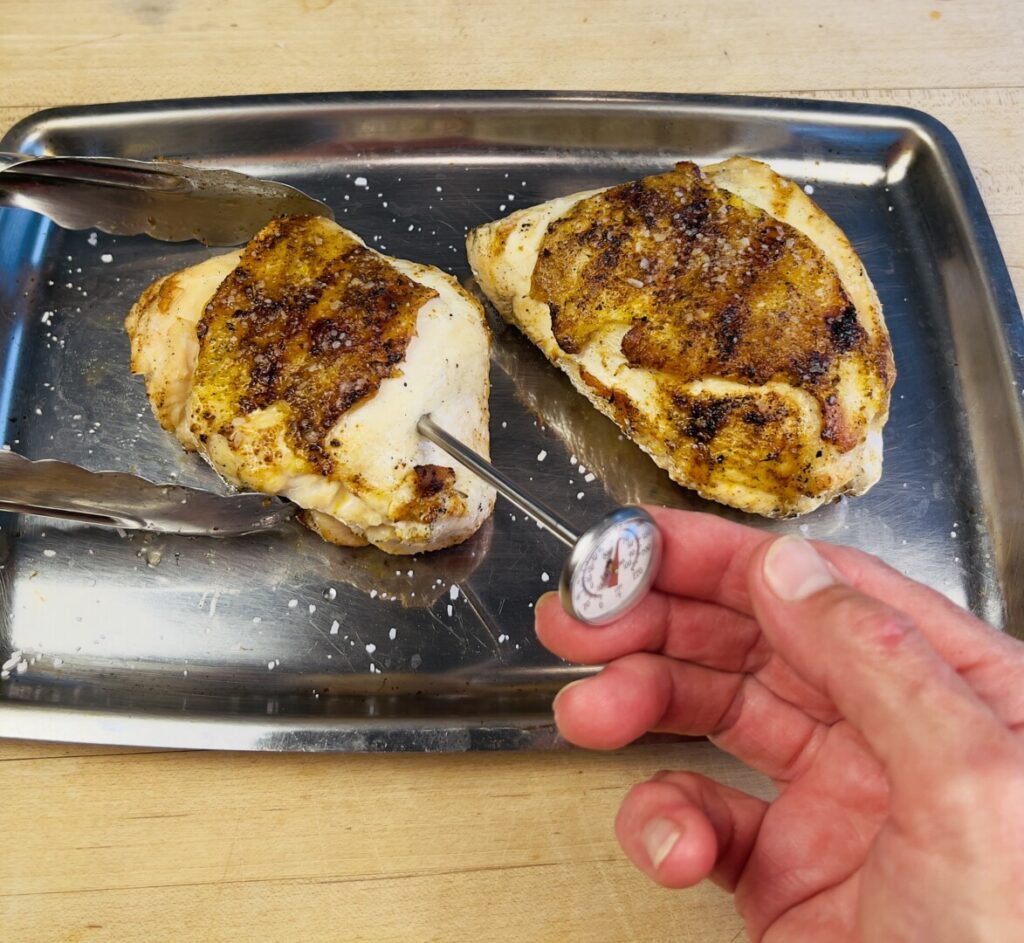To grill-roast the chicken, start with grilling directly over the flame. Squeeze a little oil on the chicken breast halves and place them on the grill grids, skin-side-down. Grill undisturbed until the skin crisps and releases from the grids. Turn the chicken and continue grilling just to brown the flesh side. Depending on the salt content of your Cajun seasoning, you may want to season the chicken with additional salt. At this point the chicken will still be raw in the center. Transfer the chicken to the holding rack above the grill grids, and close the lid. This is the roasting part of the grill-roast method. The chicken will finish cooking by roasting, surrounded by dry heat, within 7 to 10 minutes. (This gives you time to finish the maque choux.) Use an instant-read stem thermometer https://amzn.to/431ZBDN to check the interior temperature at the thickest part of each portion. Remove the chicken from heat when it reaches 160°F; carryover cooking will raise the internal temperature to the required 165°F.