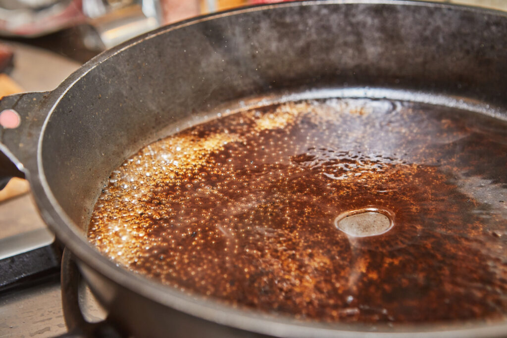 Making maque choux is a complex task, as it involves all three signature Cajun cooking techniques. You’ll start with pan-browning. Although the classic pan for cooking virtually all Cajun dishes is a well-seasoned cast iron skillet, I find that for maque choux a non-stick sauté pan is a safer and more efficient option. Using one helps ensure that the caramelized sugars lift easily from the surface and don’t scorch.