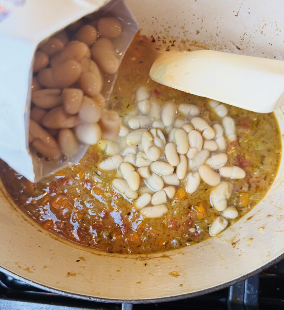 - Drain off about half of the liquid from the beans, and then add the beans and their remaining liquid.