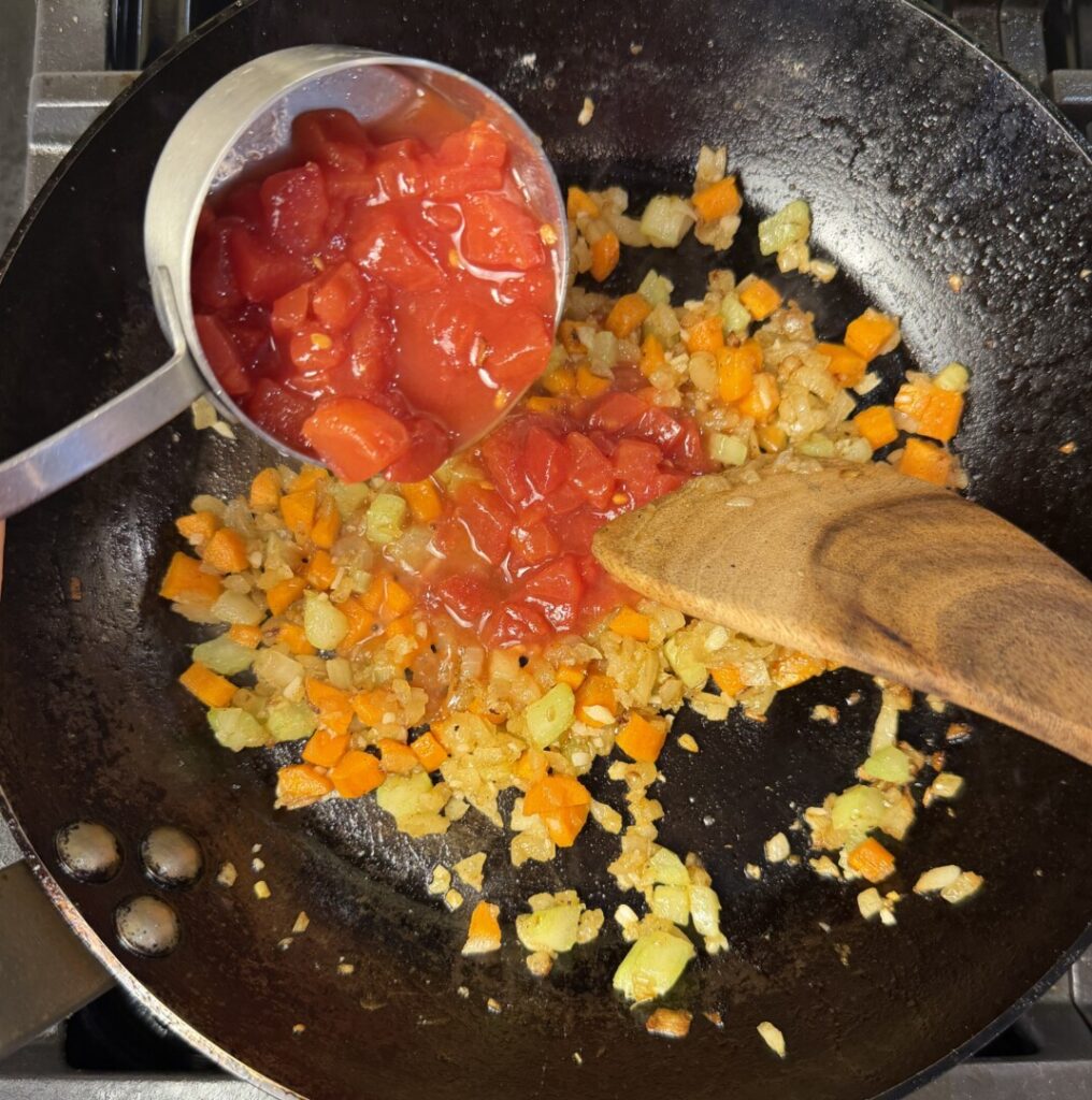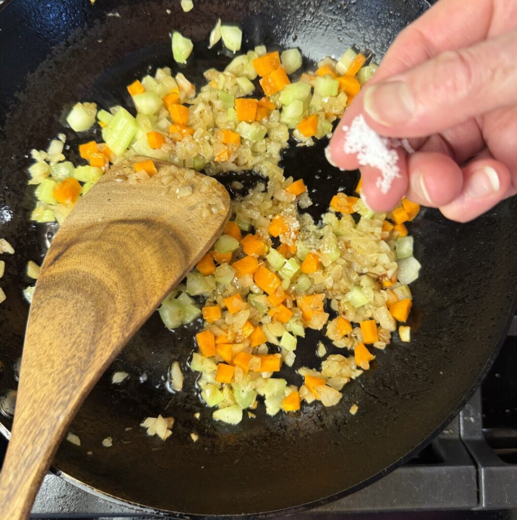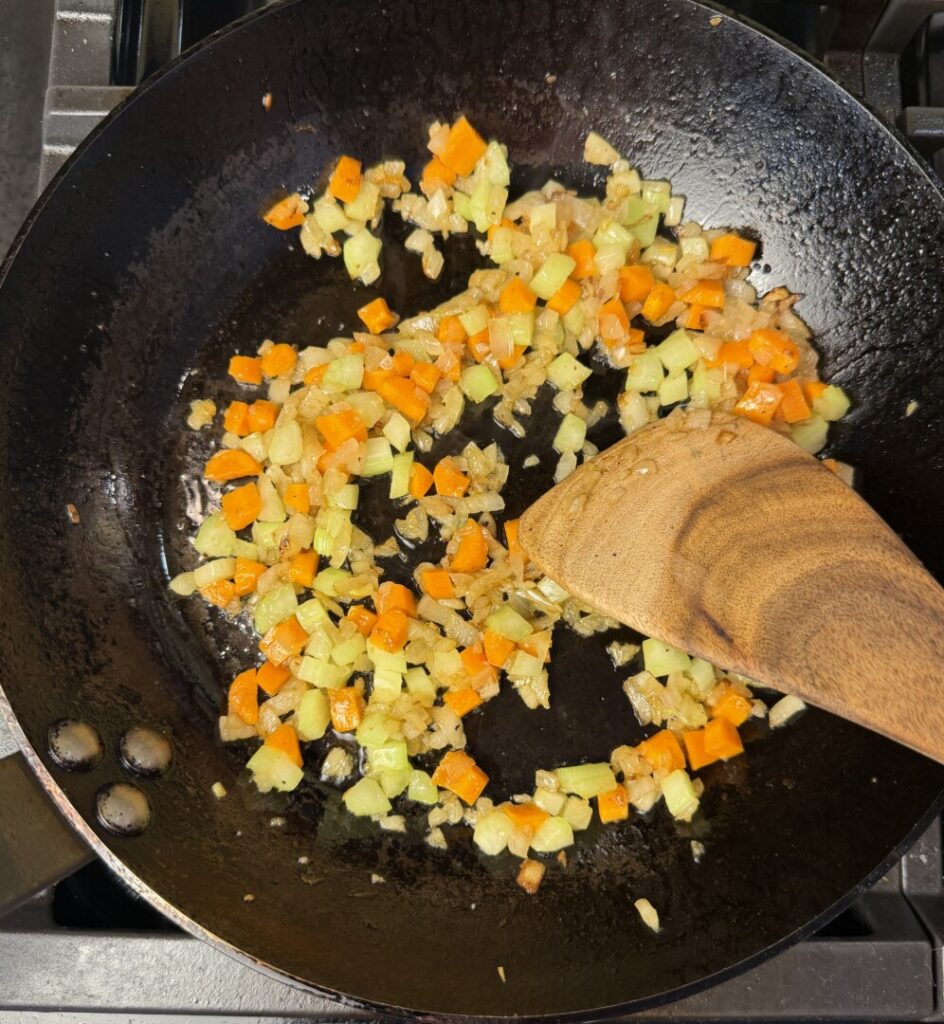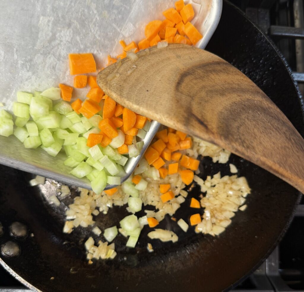- Add the celery and carrots, and sauté for about 1 minute longer.