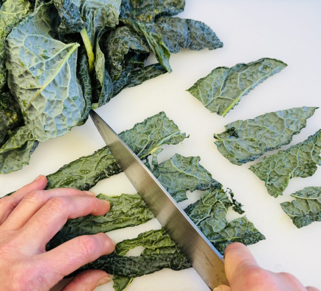 To prep the kale, first remove the stems and thick veins. Fold each leaf in half lengthwise with the smoother, paler-green side out. Pull up on the stem, gently tearing it and the attached vein off of the leaf. Rinse the kale under cold running water and then shake it dry. Cut the kale into rough rectangles about 1 inch wide and 3 inches long. If prepping ahead, store the kale in a plastic bag with a folded paper towel in the bottom to absorb excess moisture.