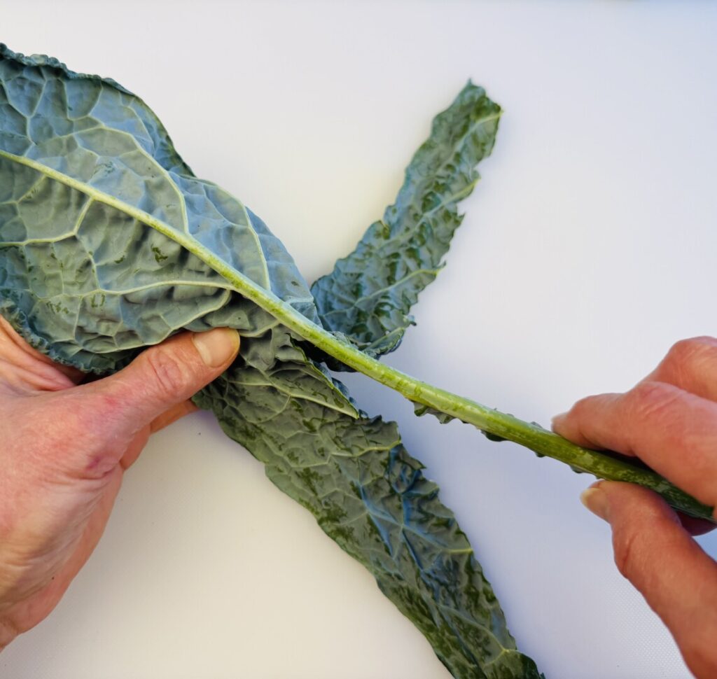 - Fold each kale leaf in half lengthwise, smooth-side-out, and then pull upward on the stem to remove both stem and the thick vein.