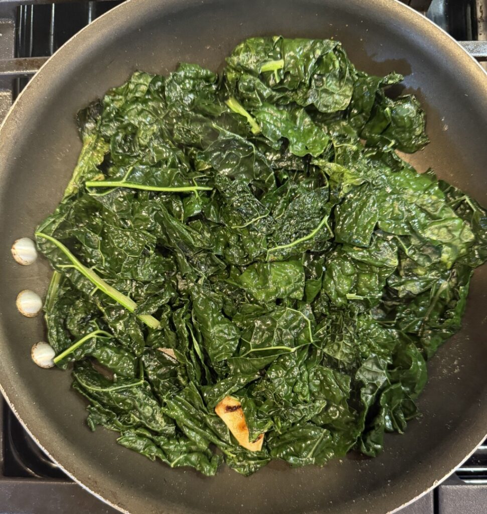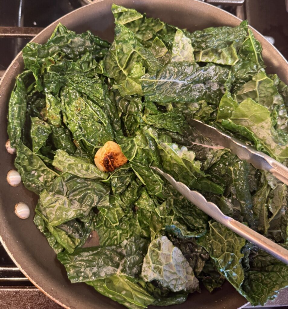 To braise the kale, heat pure olive oil in a sauté pan and add the crushed garlic clove. Sauté on both sides until it’s lightly browned and the oil is flavored. Add the kale with a little salt, and then toss and turn the leaves until they’re coated with oil and beginning to wilt. Add the water, cover the pan, and cook until tender. Watch carefully to avoid scorching; when the kale is tender the water should have been absorbed/evaporated and you should hear a faint sizzling sound.