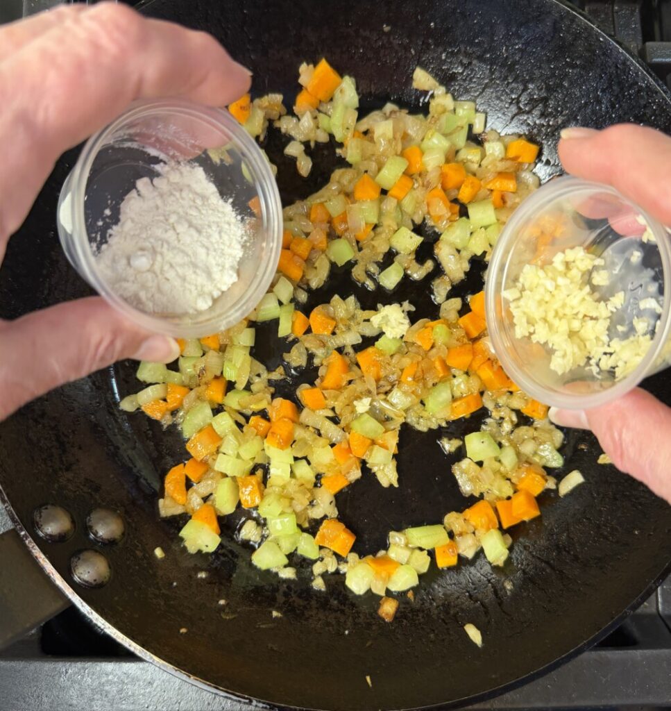 - Add the minced garlic and flour, and sauté for a few seconds to make a light brown roux.