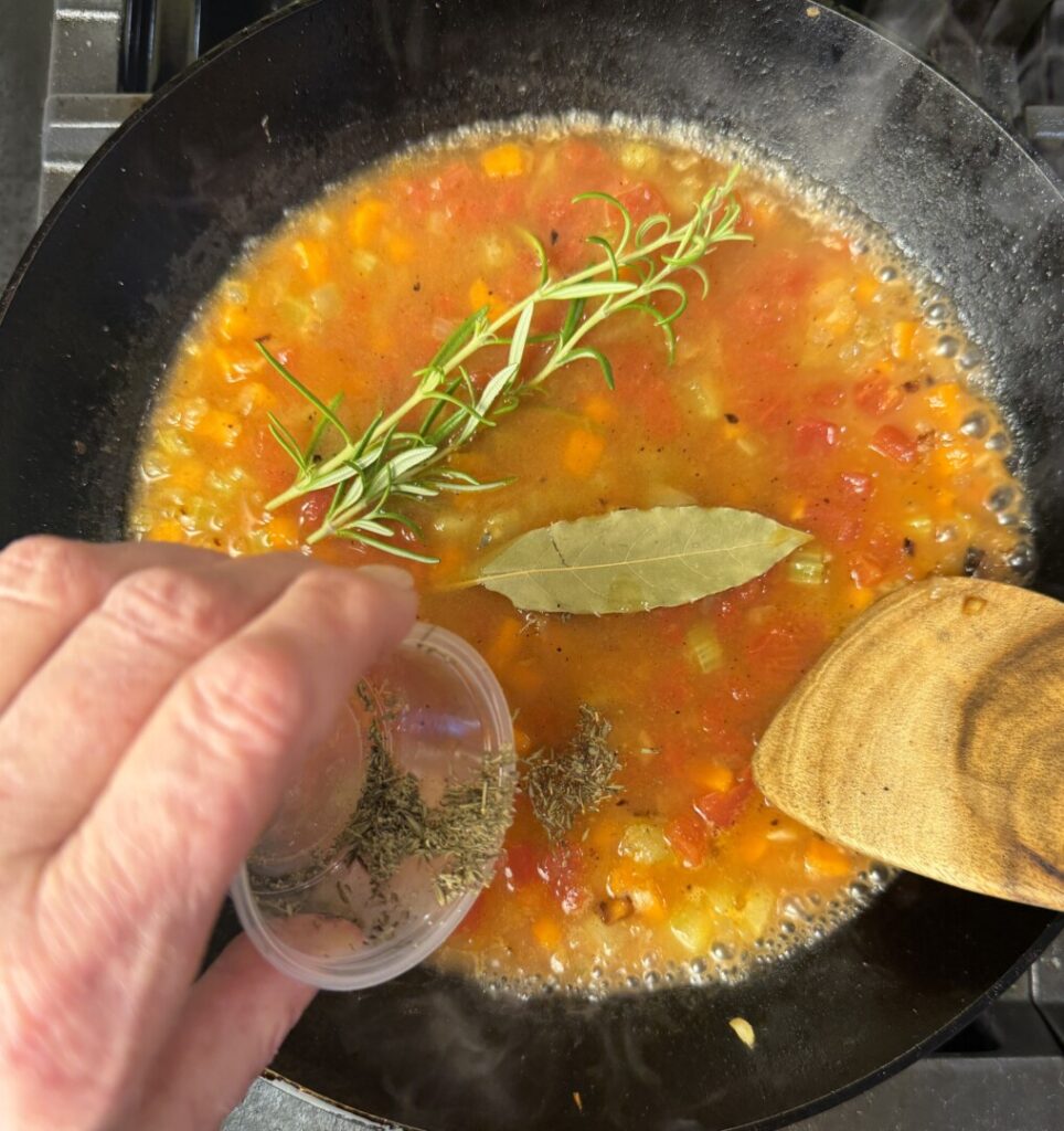 - Stir in the stock, tomatoes, sage, thyme, rosemary, and bay leaf. Bring the sauce to a simmer, then season it lightly with salt.