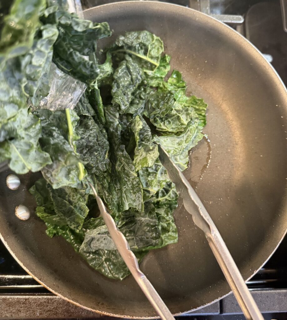 - Add the kale and a little salt, turning and packing down the kale so that it wilts and becomes coated with oil.