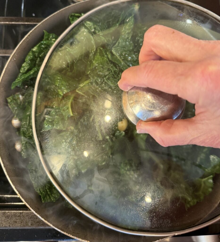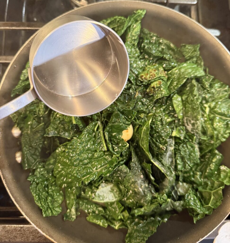 - Add the water and cover the pan. Braise on medium heat, turning the kale occasionally, for about 3 minutes until it becomes tender.