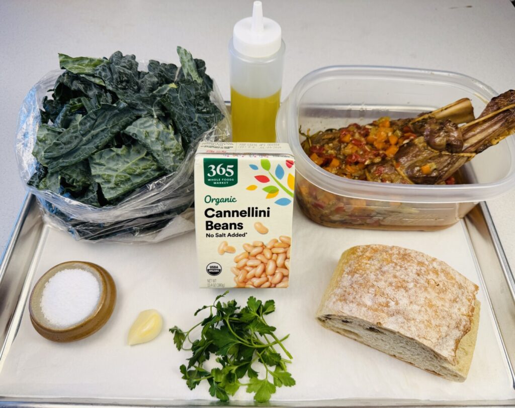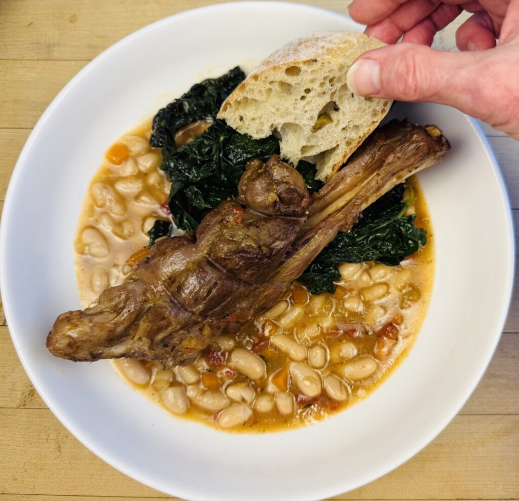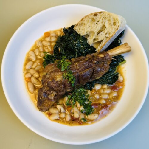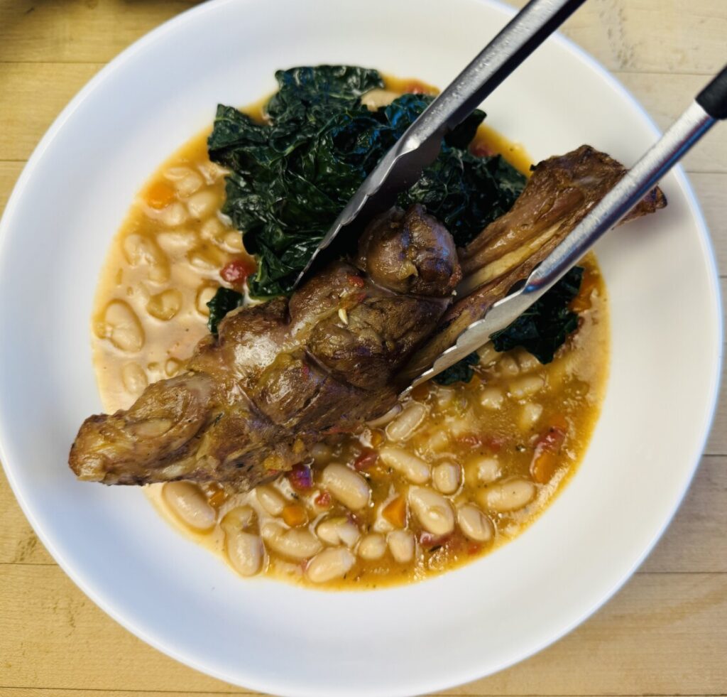 Braised Lamb Shanks with Tuscan White Beans, Lacinato Kale, and Olive Ciabatta