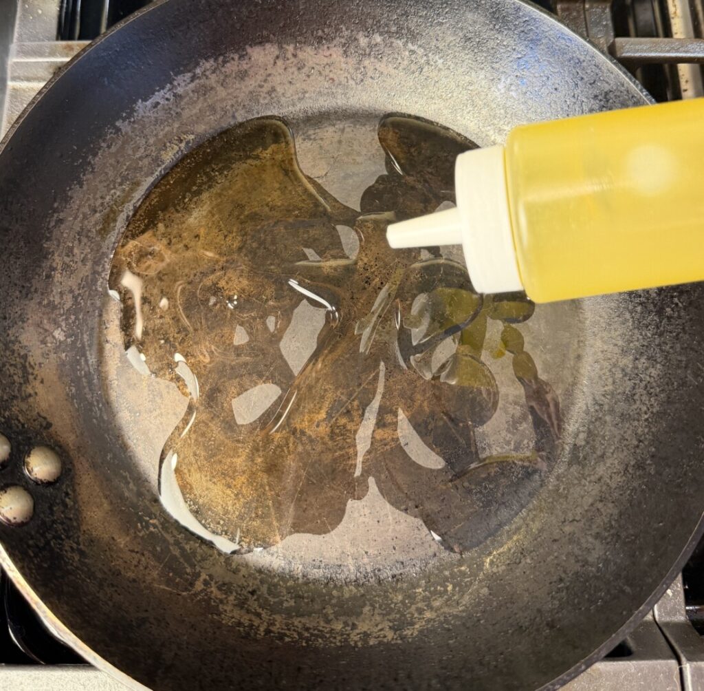 - Squeeze in about half of the step 4 oil, and swirl the pan so that oil coats the bottom surface and partway up the sides of the pan.