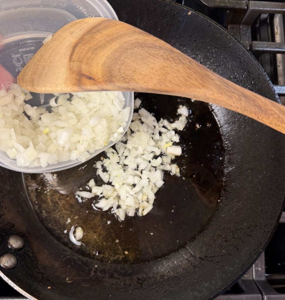 - Add the remaining oil and the onions. Sauté, stirring and scraping to lift the sucs (browned bits of protein) from the surface of the pan. Sauté for about 1 minute until the onions are lightly browned.