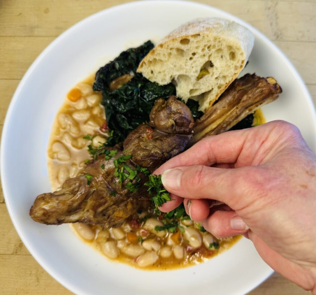 Use sanitized kitchen scissors to cut the trussing twine off of the lamb shanks. Ladle a portion of beans and sauce into each warmed shallow bowl or dinner plate. Remove the garlic clove from the kale and then place a mound of kale on the back right of the beans. Arrange a lamb shank diagonally across each plate with the small end of the shank propped against the kale. Place a portion of ciabatta between the shank and the kale, and then sprinkle a line of parsley across the shank.
