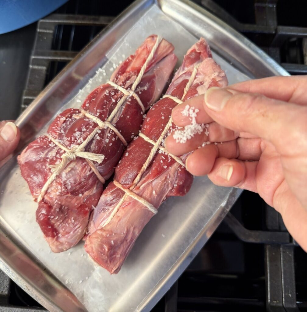 If you’re making this recipe with osso buco-cut lamb shanks, truss each piece as shown in the photo on the right.