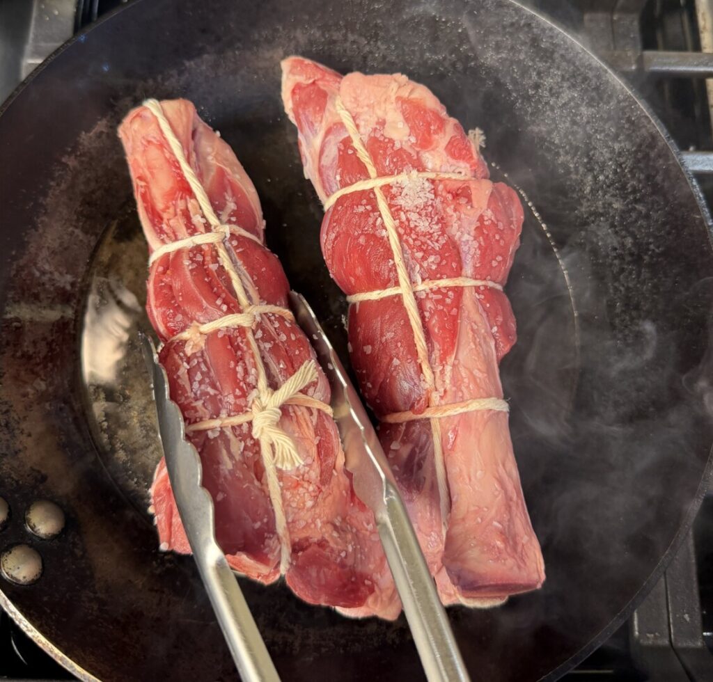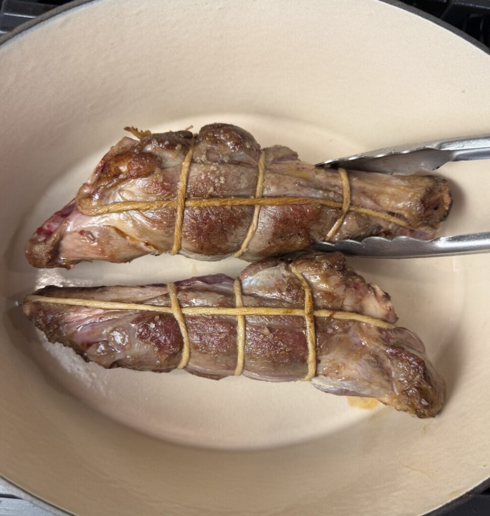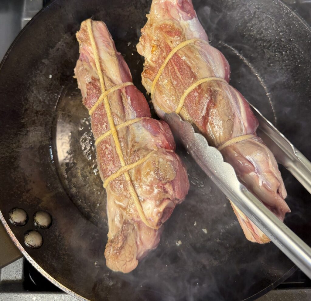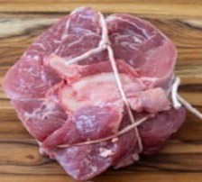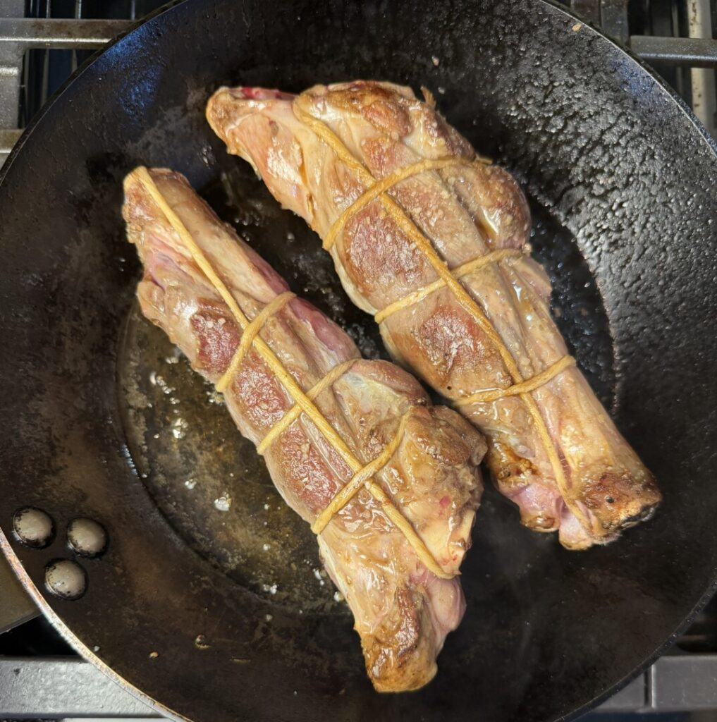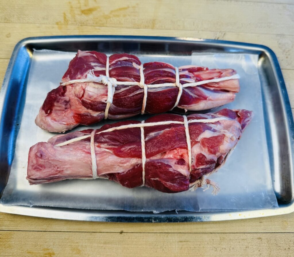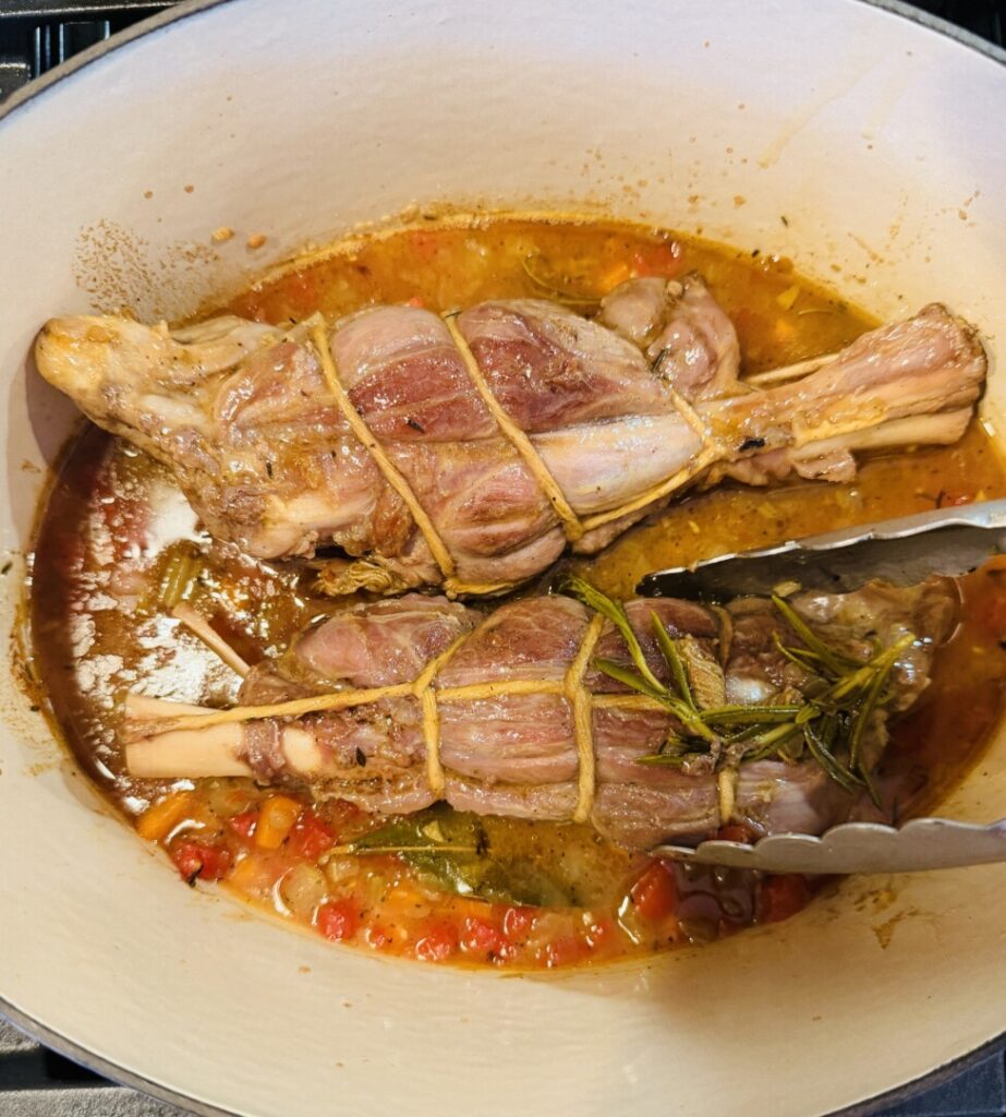 The hind shank is larger, yielding enough meat for two or more portions. If a hind shank is cooked whole, the meat is usually removed from the bones after cooking—either portioned in the kitchen or carved at table. Alternatively, a raw lamb hind shank may be sawed across the bone into rounds similar to osso buco, the well-known Italian veal cut. You can make this recipe with hind shank osso buco pieces; truss them as shown in the process photo shown later in this post.