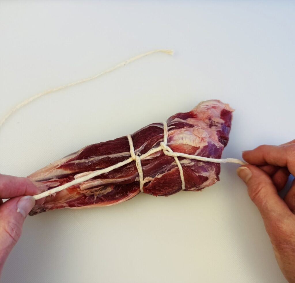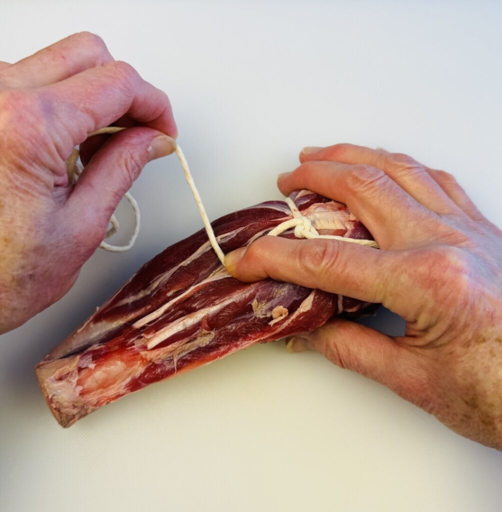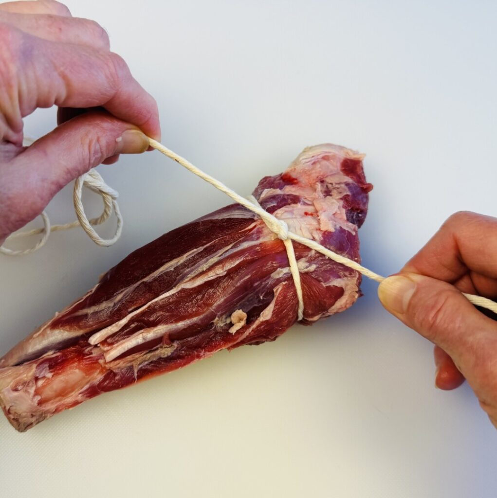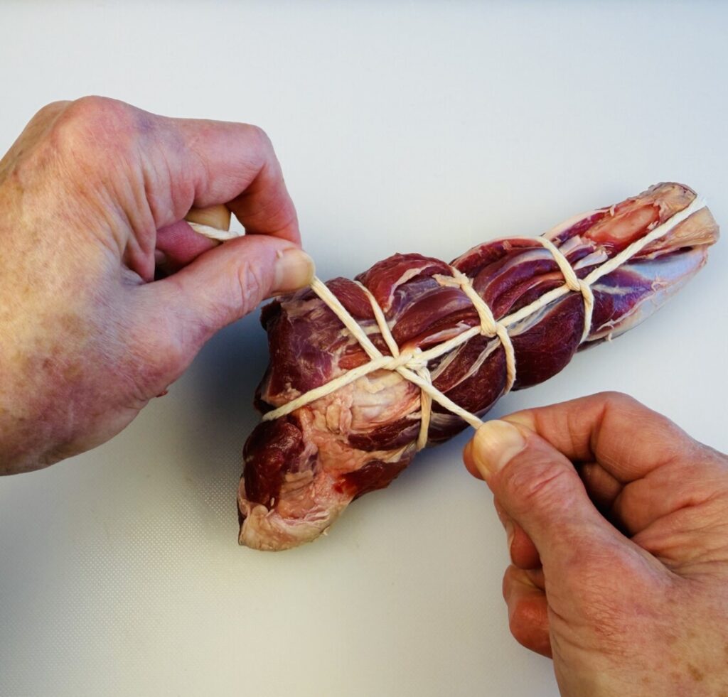 - Use kitchen twine to truss each shank, looping the twine tightly around the thick end, the center, and the narrow end as illustrated.
