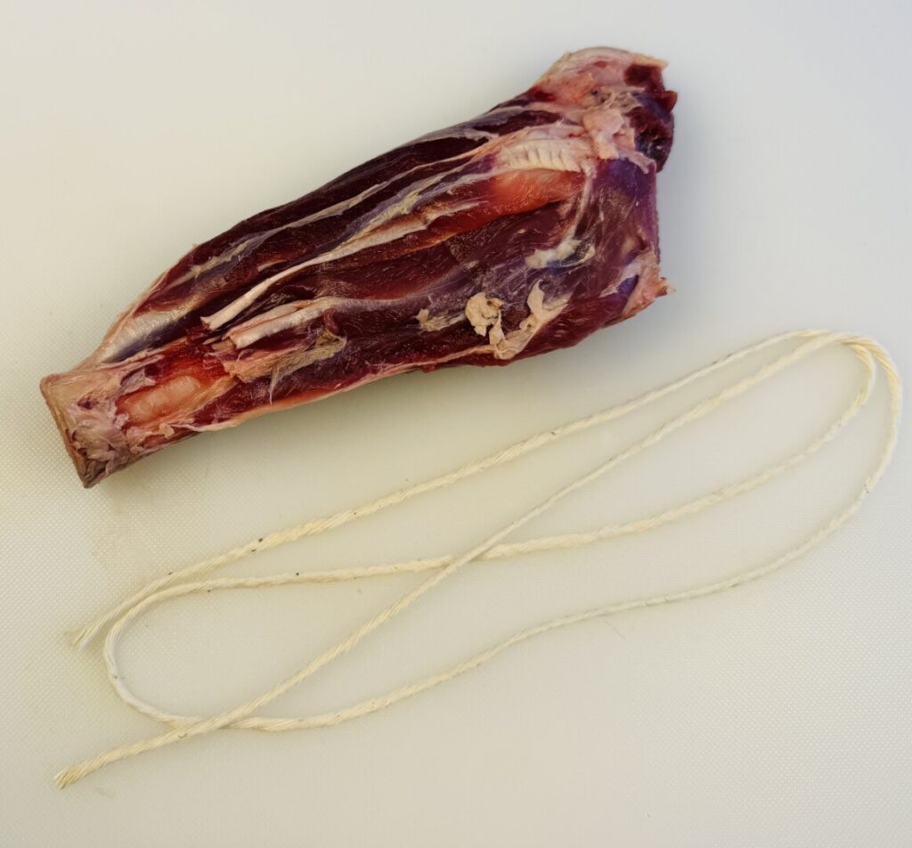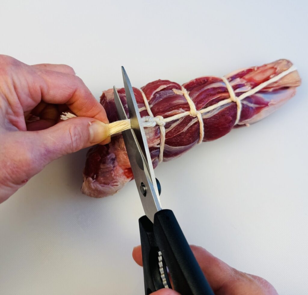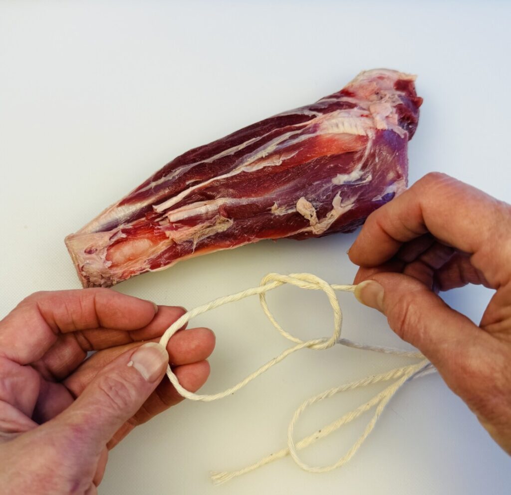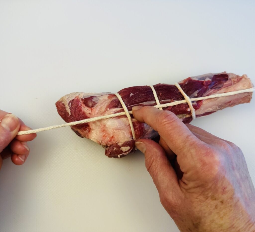 - Use kitchen twine to truss each shank, looping the twine tightly around the thick end, the center, and the narrow end as illustrated.