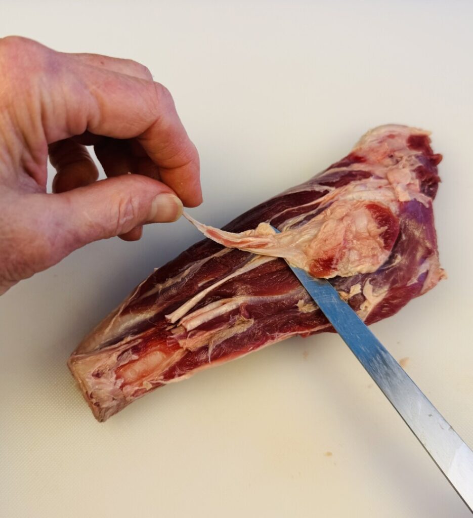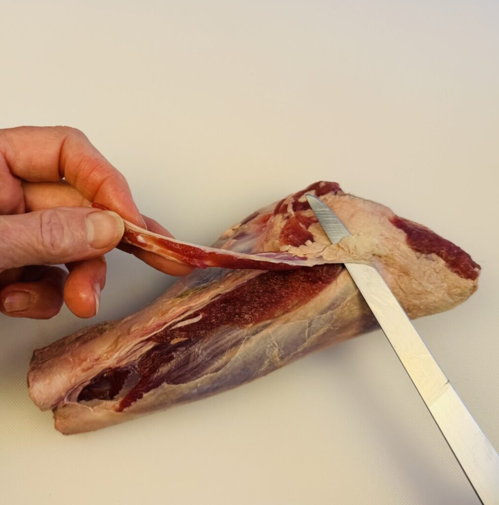 By definition lamb is a young animal, technically under 1 year of age but usually harvested between 6 and 8 months. At this age a lamb carcass has developed a substantial amount of silverskin, but its meat remains relatively tender in comparison to a more mature animal. In order to fully gelatinize all of its naturally-occurring silverskin, the meat needs to be cooked for too long a time. The answer to this dilemma is to remove the thickest part of the silverskin, leaving just enough to provide sufficient collagen content. The photos below show you how to use a sharp, flexible boning knife to remove silverskin (and any surface fat).