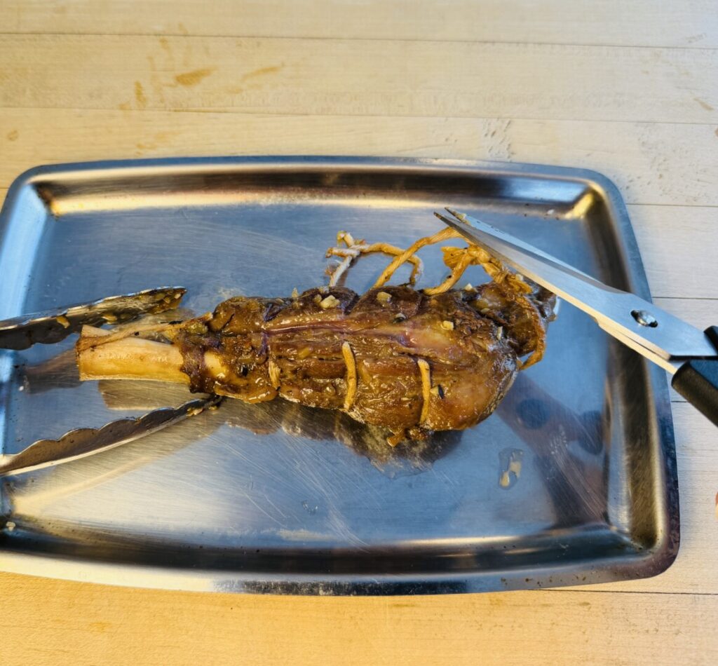 - Use sanitized kitchen scissors to cut off and remove the trussing string from each lamb shank.