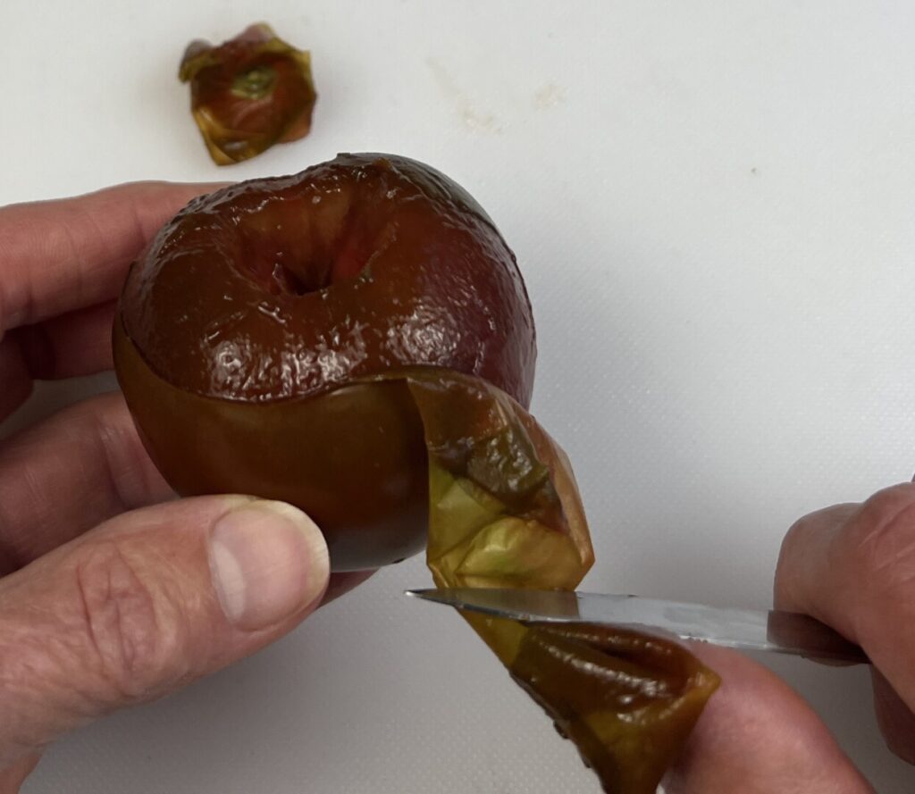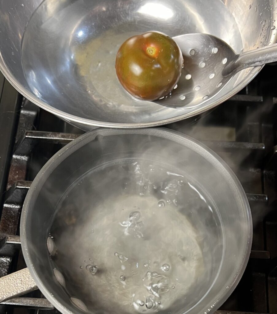 - Blanch the tomato in boiling water for a second or two, refresh it under cold water, remove the core, and slip off the skin.