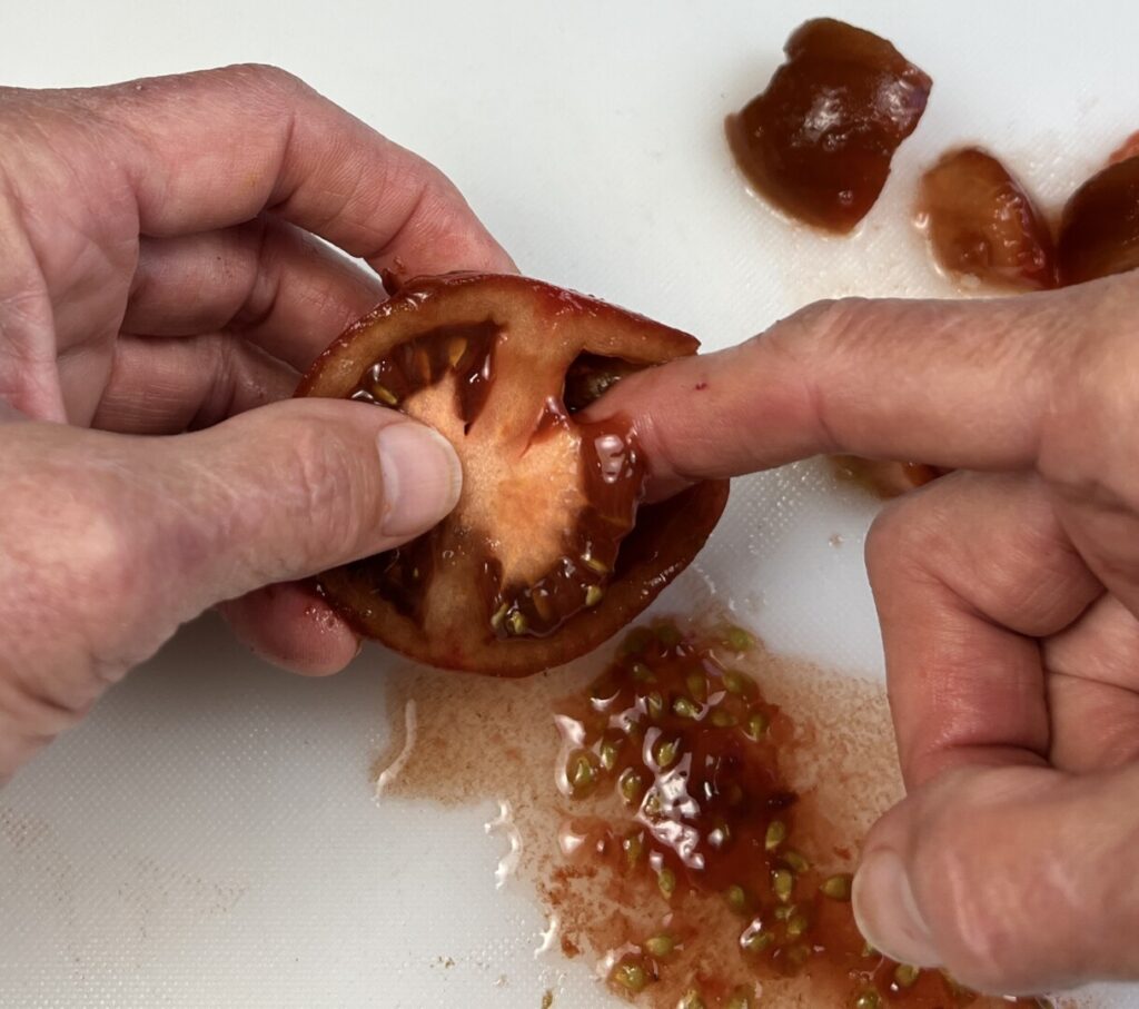 - Cut the tomato in half widthwise and remove most of the seeds.