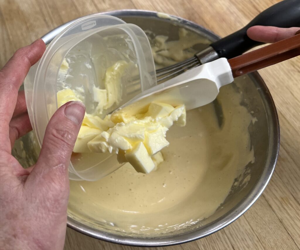 - Whisk the soft butter into the sabayon until smooth. (If either ingredient is too cool, the mixture may appear curdled; that’s OK, as it will smooth out when the chocolate is added.)