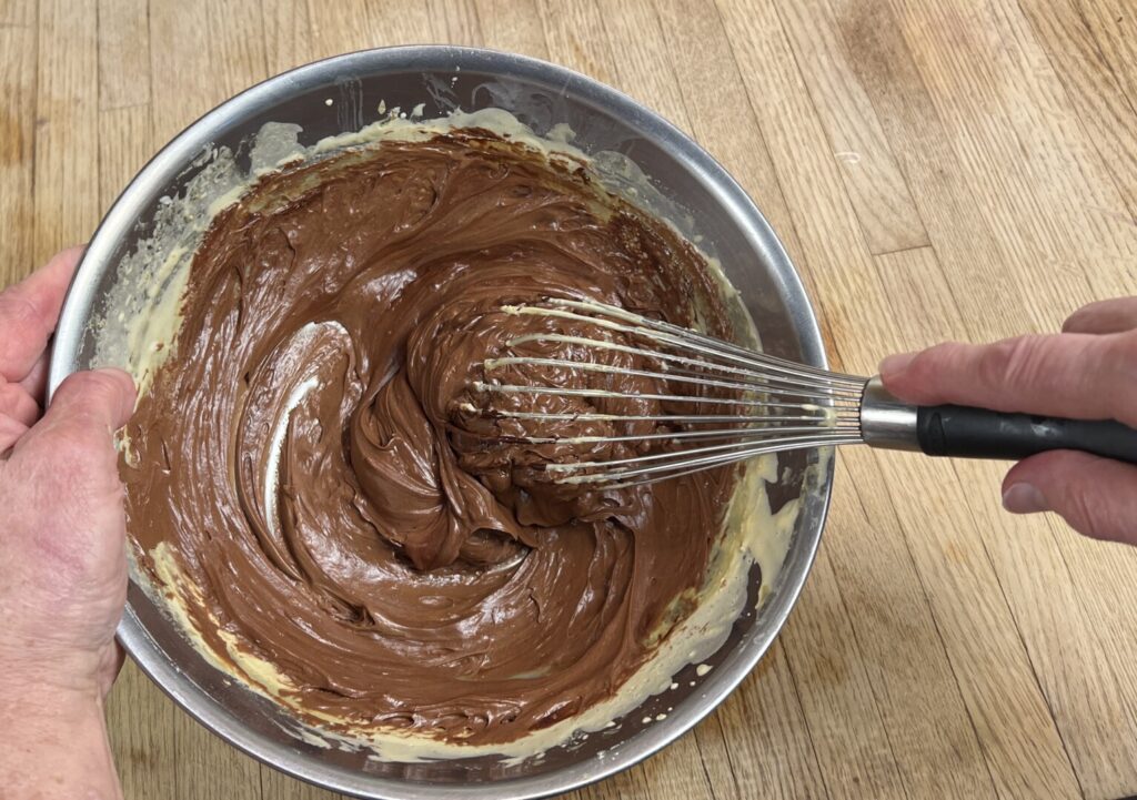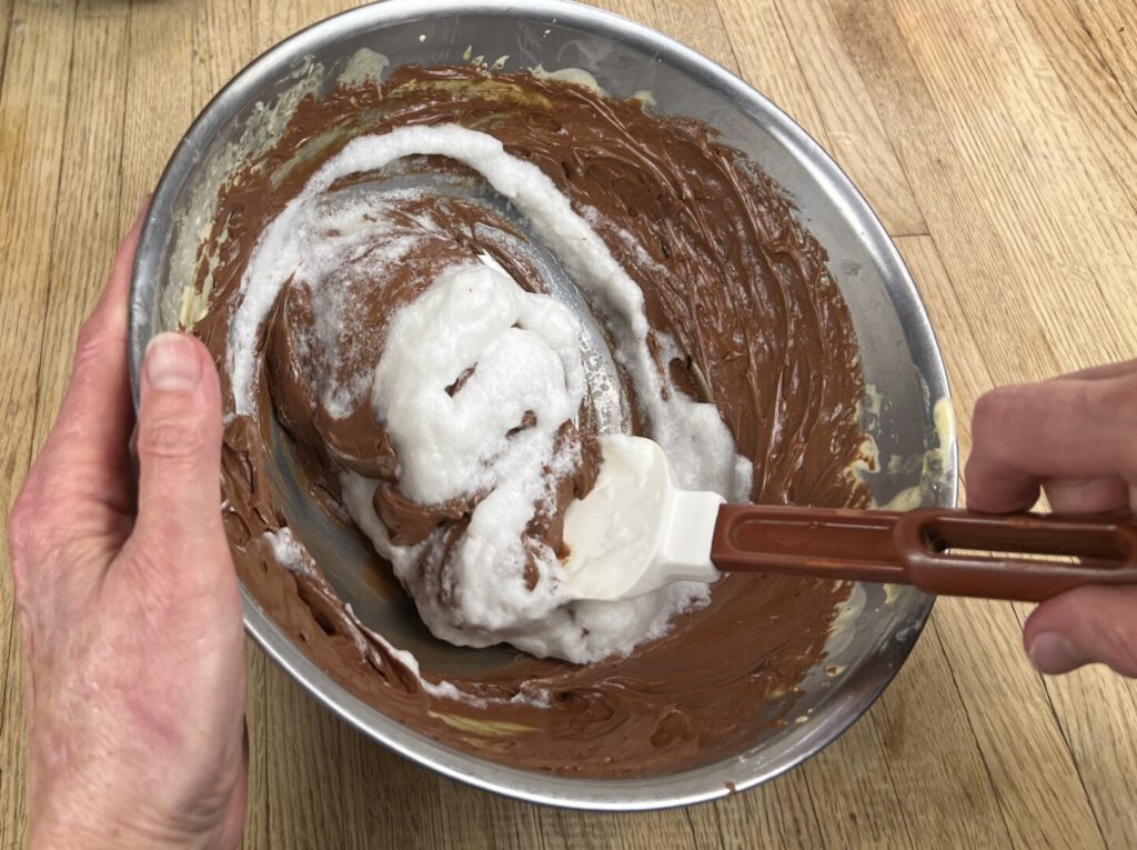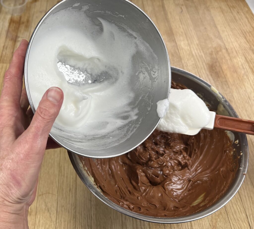 - Fold the beaten egg whites into the mousse base until until the mixture becomes light, fluffy, and homogenous in color.