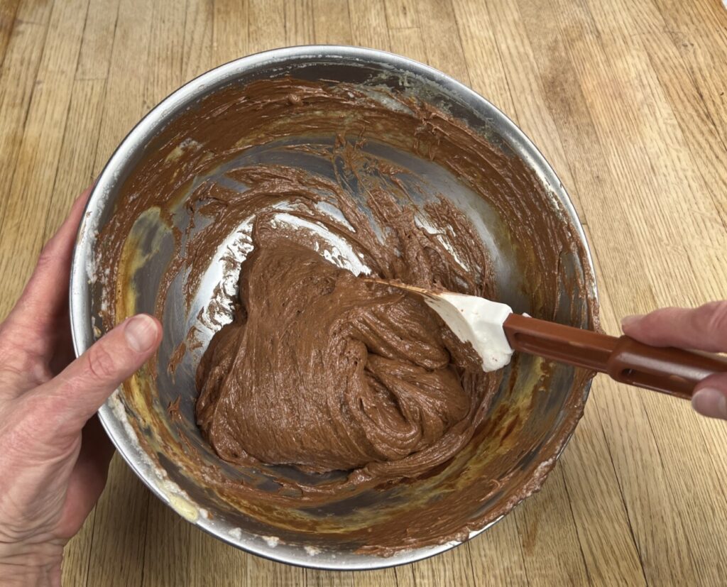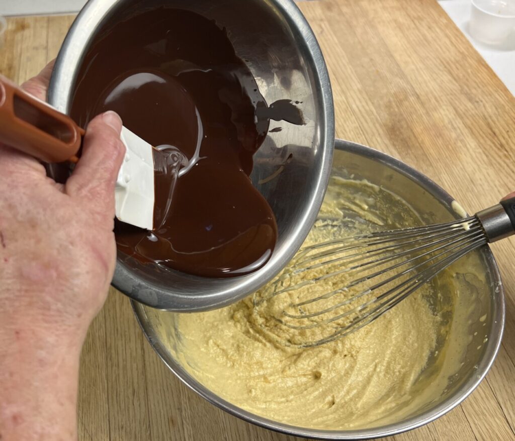 To complete the mousse base, fold in the butter, which must be very soft. If necessary, heat it for a few seconds in a microwave oven, but don’t let it melt. Then, stir in the warm chocolate until the color is homogenous.