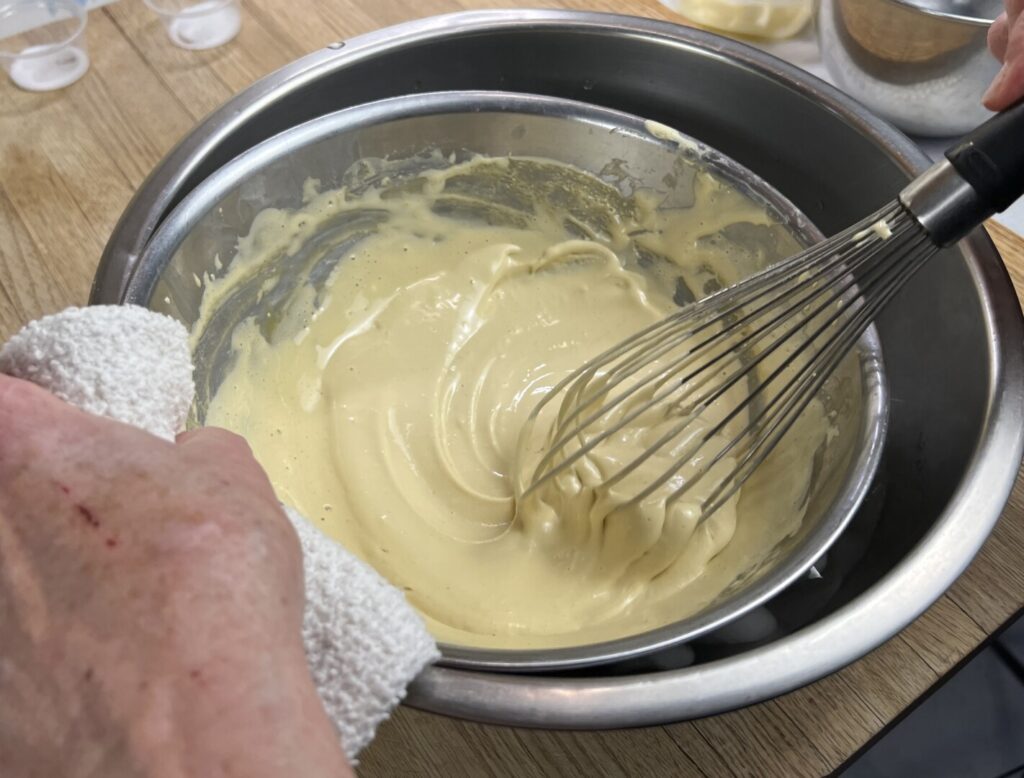 - When the sabayon is thickened and hot, transfer its bowl to the ice water bowl and continue to whisk until barely warm. Immediately remove from the ice bath; do not allow it to become cold.
