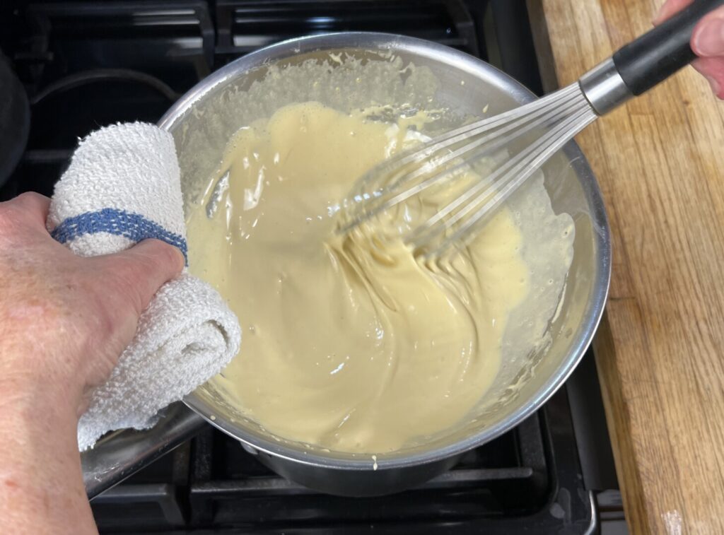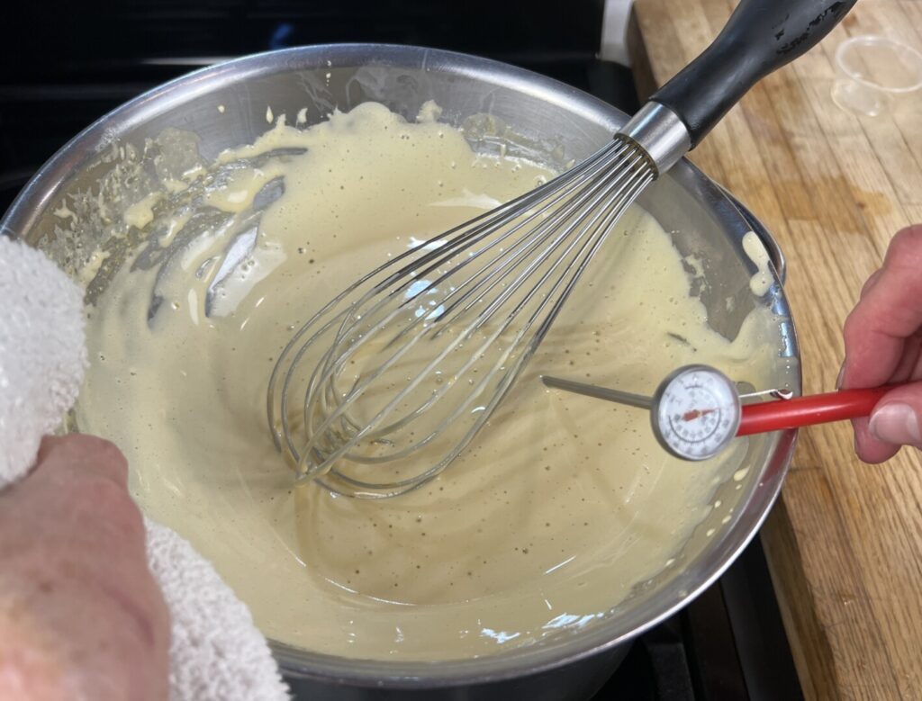 - Fit the yolk mixture bowl into the saucepan of barely simmering water. Whisk constantly for about 3 minutes until the mixture becomes foamy, thickens to a custard-like texture, and reaches a temperature of 135°F. (If you test it with your finger, it should feel slightly too hot for comfort.) Take care not to overheat it, lest it curdle.