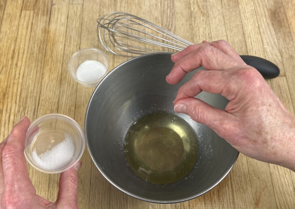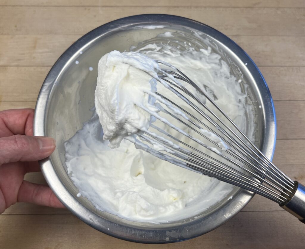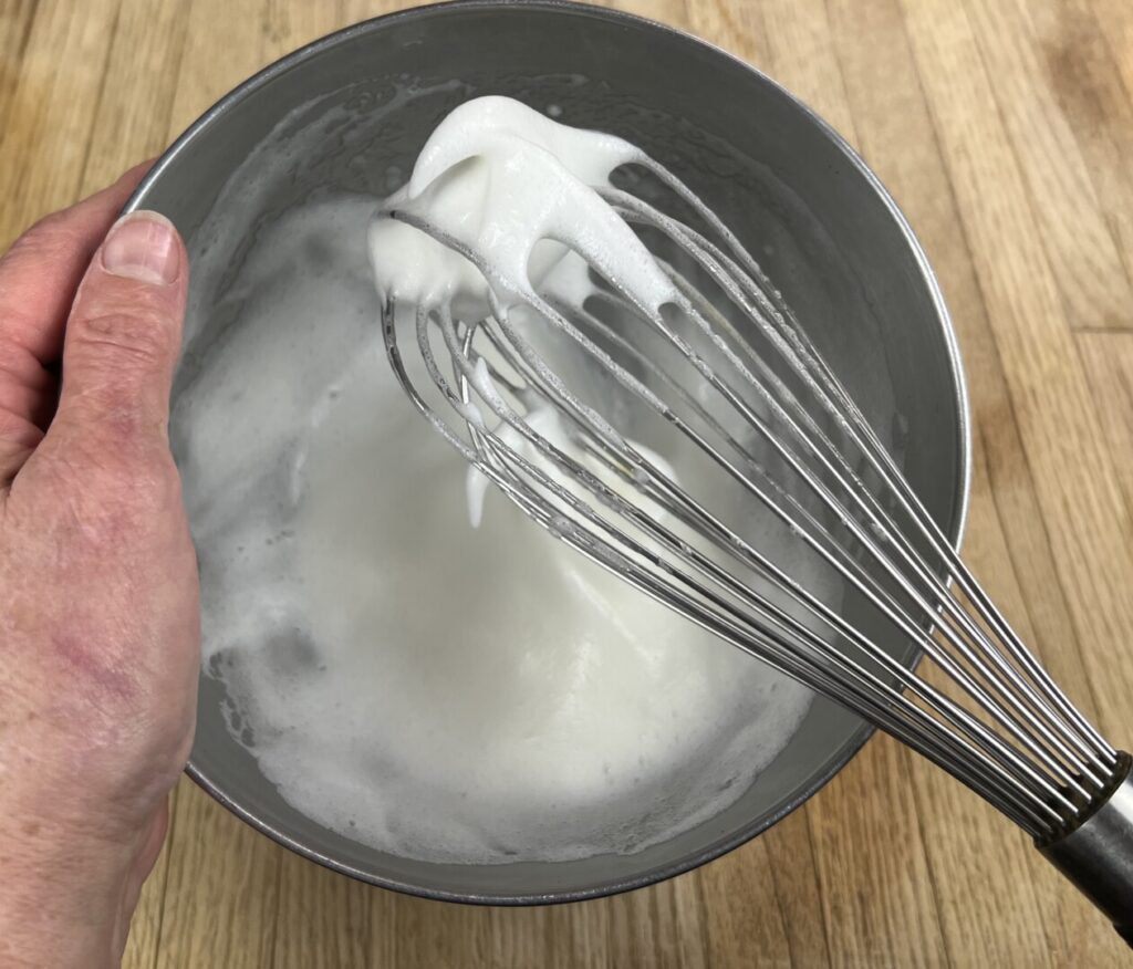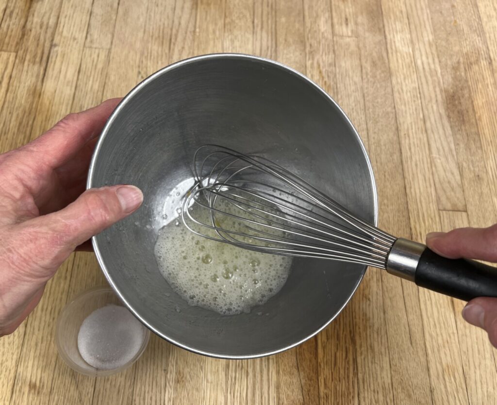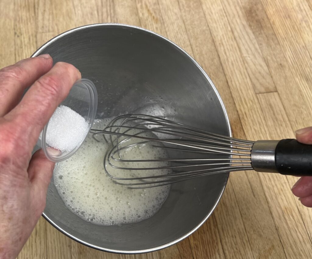- Whip the step 6 sugar and the salt into the whites and then continue whipping vigorously to firm peaks. Don’t overbeat to a stiff or crumbly texture.