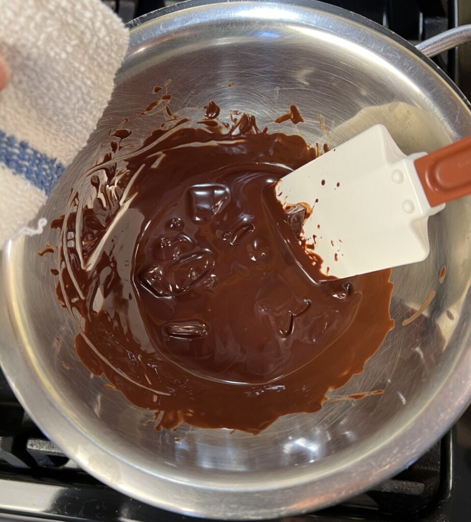 - Fill the bowl’s saucepan with about 1 inch of water. Place the saucepan over low heat and then set the bowl of chocolate in it. Stir and scrape the chocolate with a plastic spatula until it’s completely melted and smooth. Don’t allow the chocolate to get too hot or to get even a drop of liquid in it, or it may seize up and become unusable.