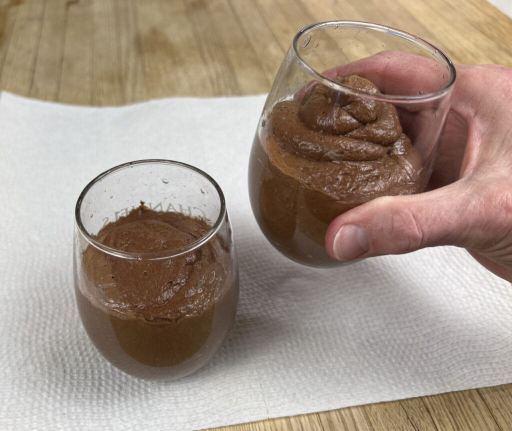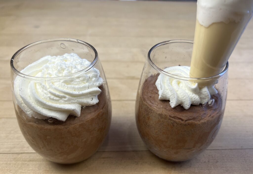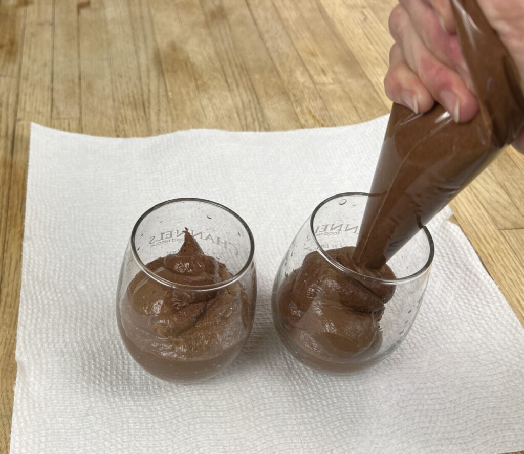 - Cut off about ½ inch of the bag’s pointed end, and insert it into one of two serving glasses or cups. Pipe half of the mousse into each glass. (Alternatively, spoon or scoop the mousse into the glasses.)