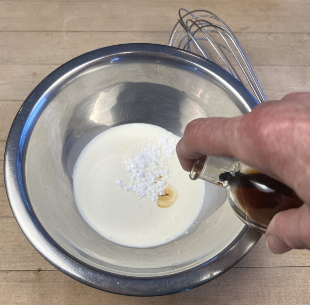 - Combine the cream, confectioner’s sugar, and vanilla in the chilled bowl.