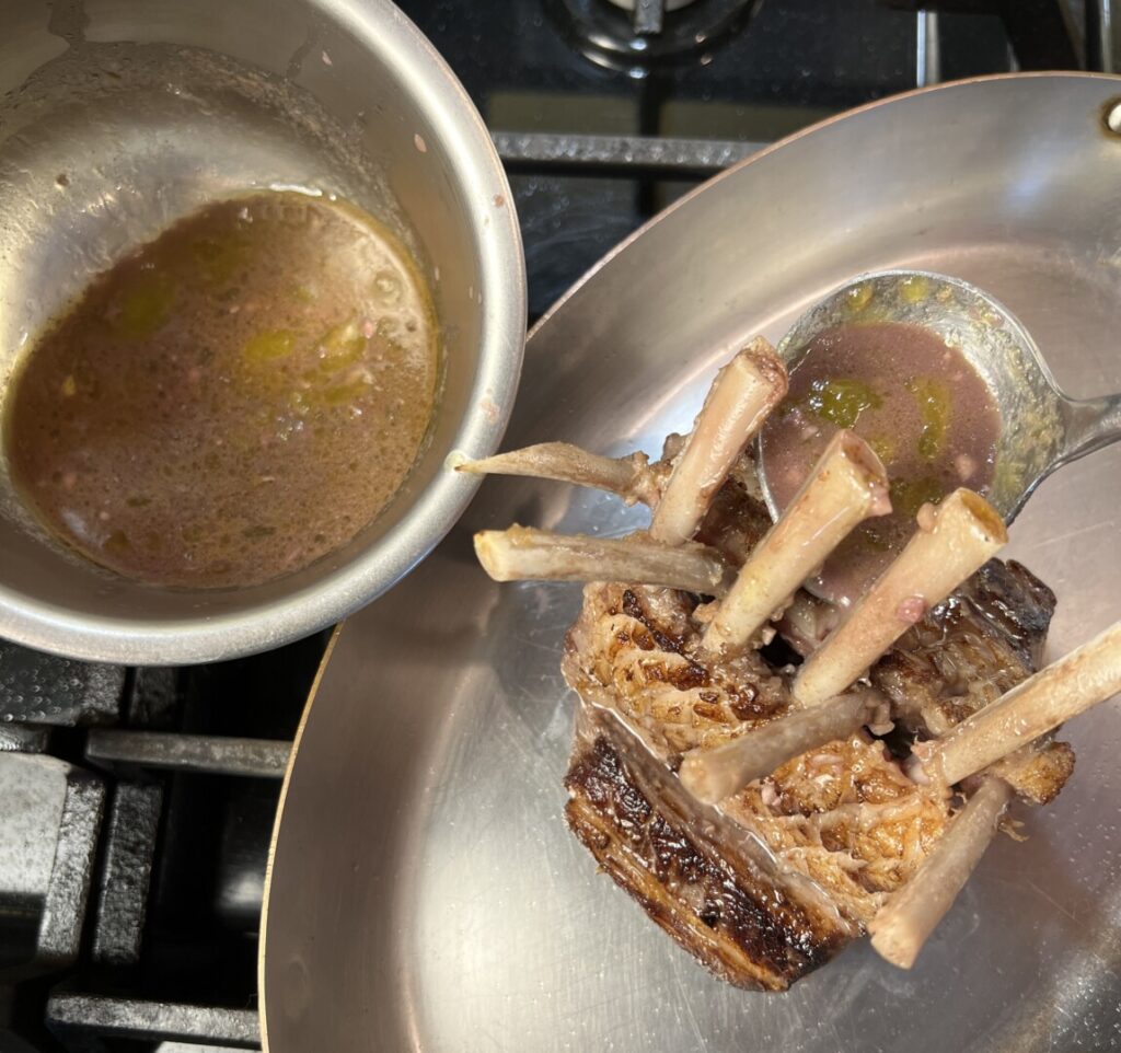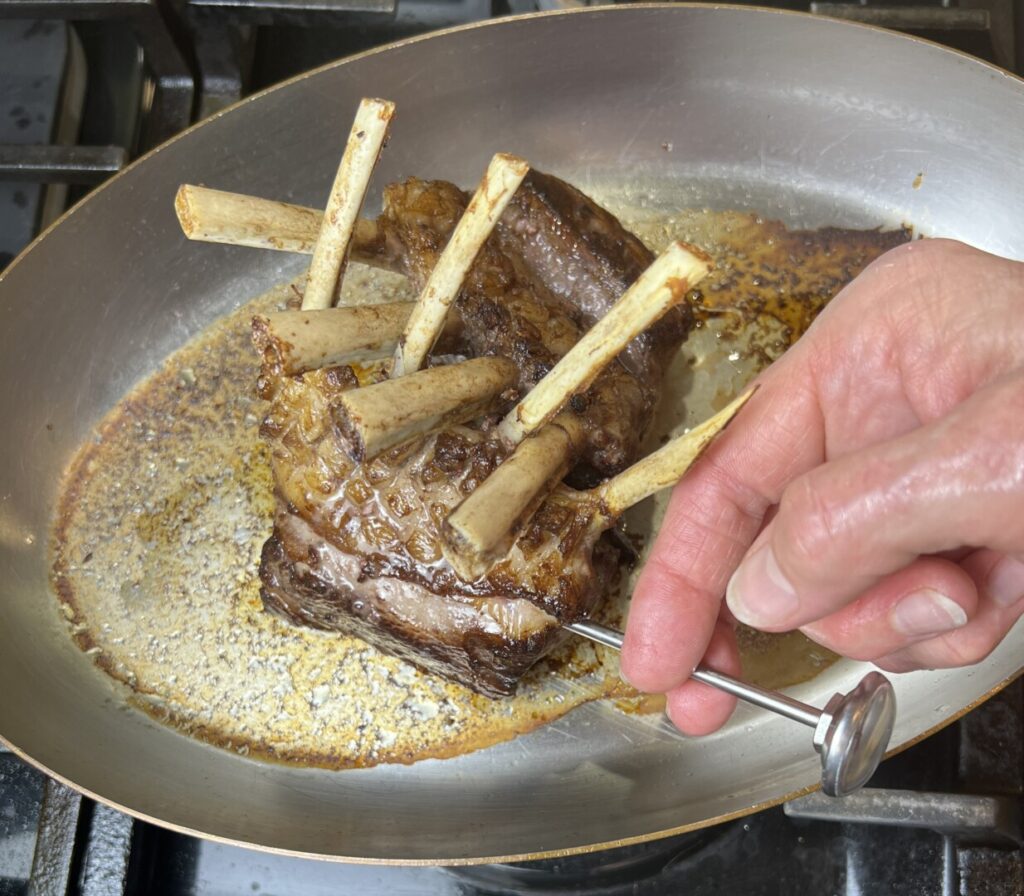 Once the potatoes are in the oven, pan-sear the racks. Heat a pan, blot them dry, and sauté them meaty-side-down until golden brown. Press down on the bones to ensure a good sear on the crosshatched fat. Then turn them up on end, rib bones intertwined, to brown the bottom of the eye meat. Transfer to a roasting pan, baste with marinade, and finish roasting. Use a thermometer to judge doneness: 125°F for rare or 130°F for medium rare. Transfer the racks to a cutting board set in a sheet tray, and rest them for a few minutes in a warm place to allow the interior juices to redistribute throughout the meat.