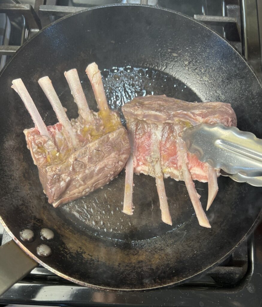 - Place a sauté pan over medium heat until hot. Add the pure olive oil, and then add the racks, meaty-side-down. Sauté about 1 minute until golden brown.