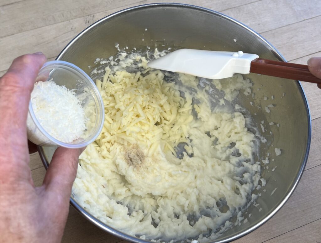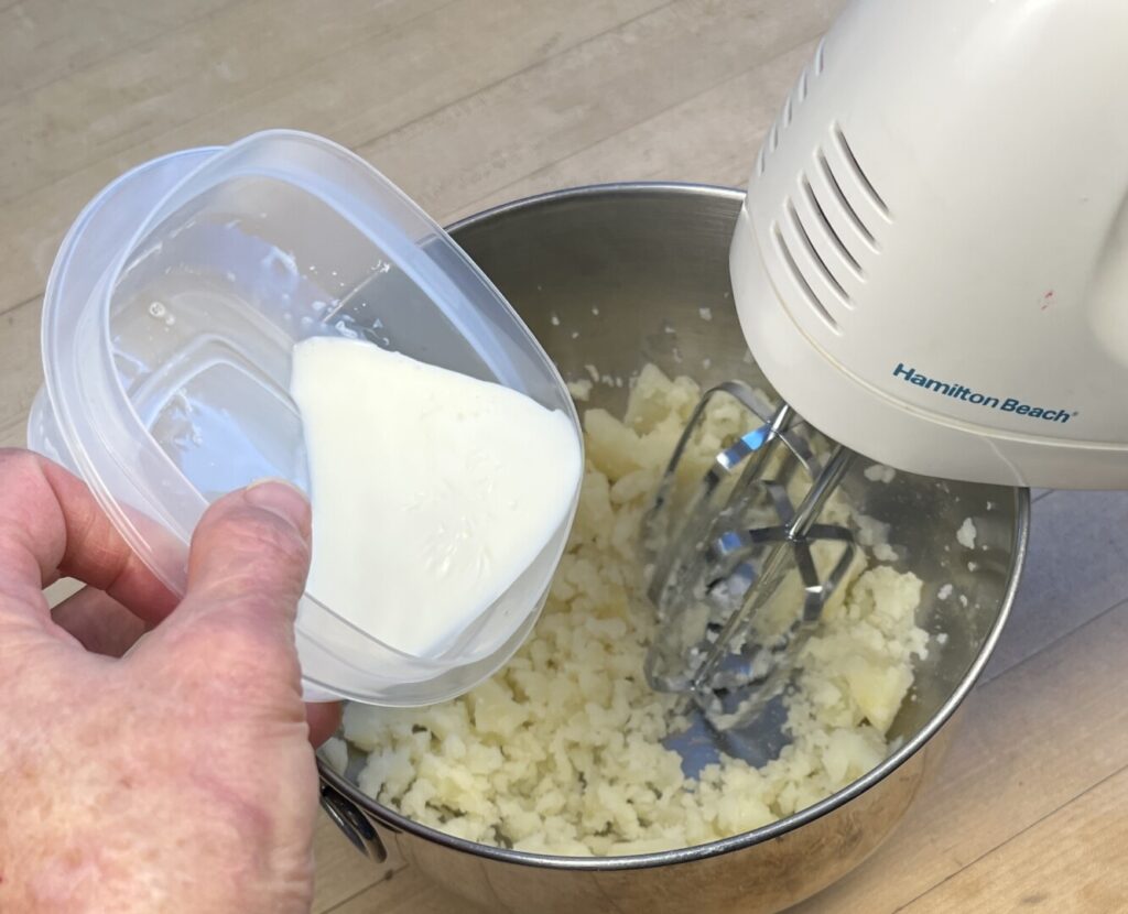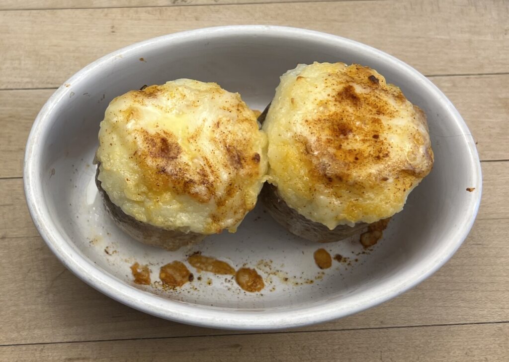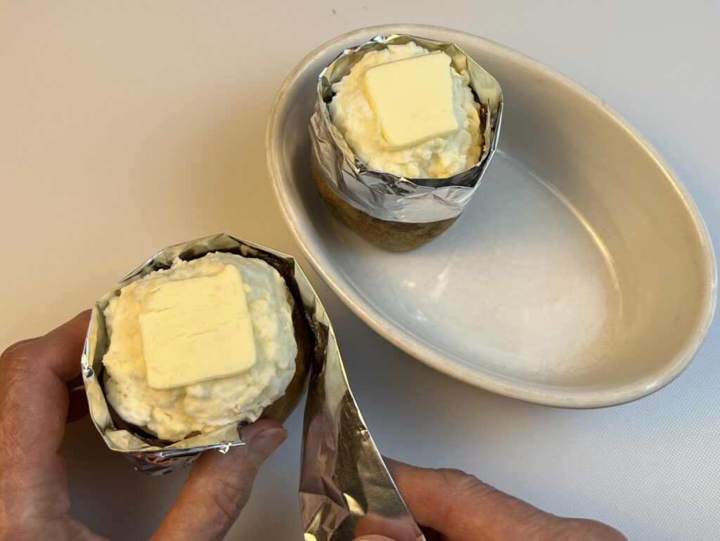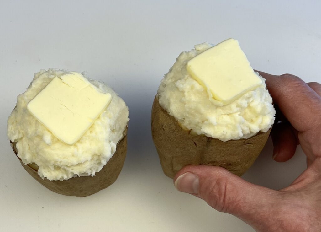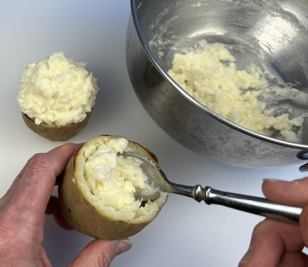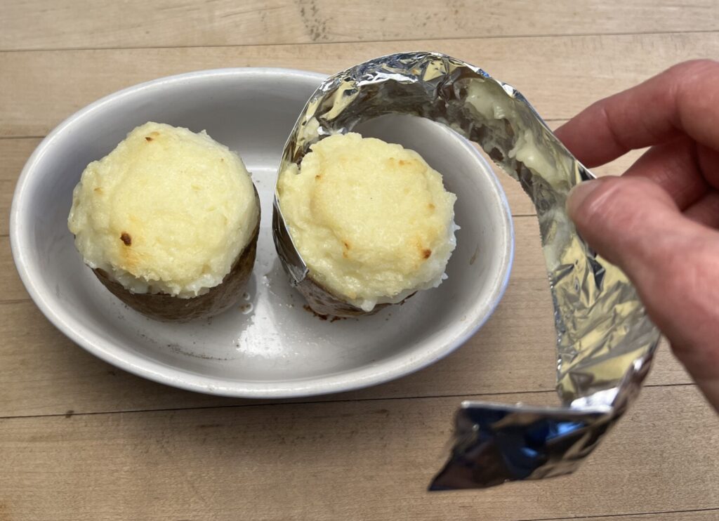 Break up the warm potato flesh using an electric hand mixer; alternatively (but less effectively), you can use a whisk. Quickly beat in the hot half-and-half and soft butter. Don’t over-mix! If you whip potatoes for too long a time you activate amylase, an enzyme that breaks down the starches in the potatoes, causing an unappealing, gluey texture. Better to have a few lumps than a bowlful of glue! Fold in the cheeses and check the seasoning. Stuff the potatoes, gently packing in the filling and forming a mounded top, and then top with a thin pat of butter. An aluminum foil “collar” will keep the filling in place while baking.