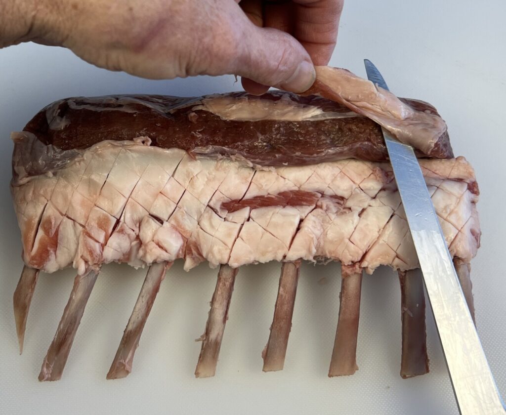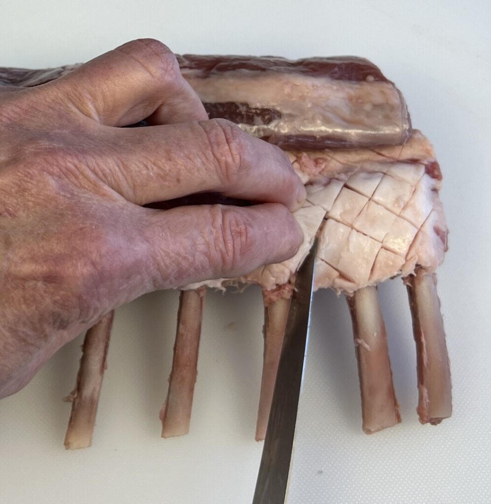 If necessary, you may have to trim off some of the thick fat cap remaining on the meaty side of the rack, as shown in the photo above. But most lamb racks available to consumers already have had this removed. You’ll likely need to trim away some of the thicker connective tissue that remains, and clean up the rib bones if any of the connective tissue sheath remains clinging to them. Scoring the surface fat by cutting a cross-hatch pattern into it allows the excess fat to render out from underneath, leaving a crispy crust and creating an attractive appearance. Although you can pan-roast a whole rack, dividing it into two portions makes it easier to handle.