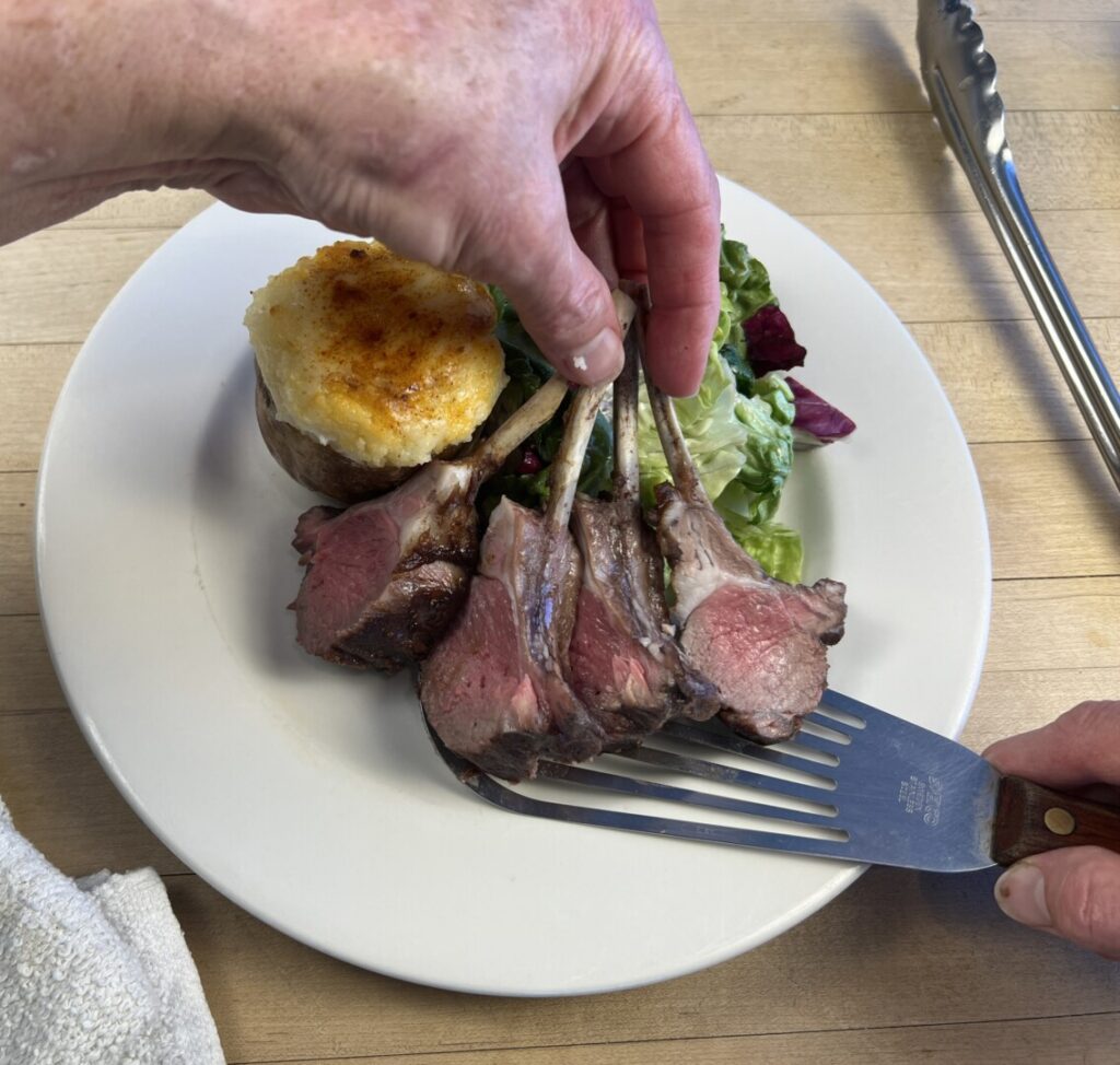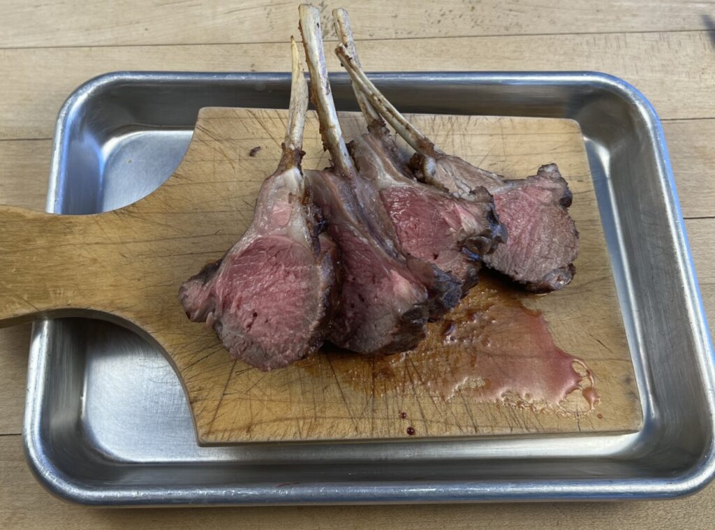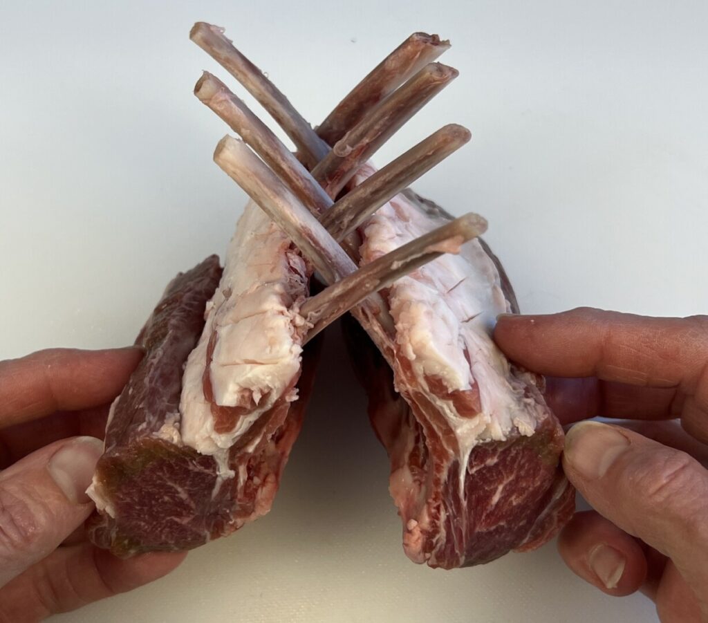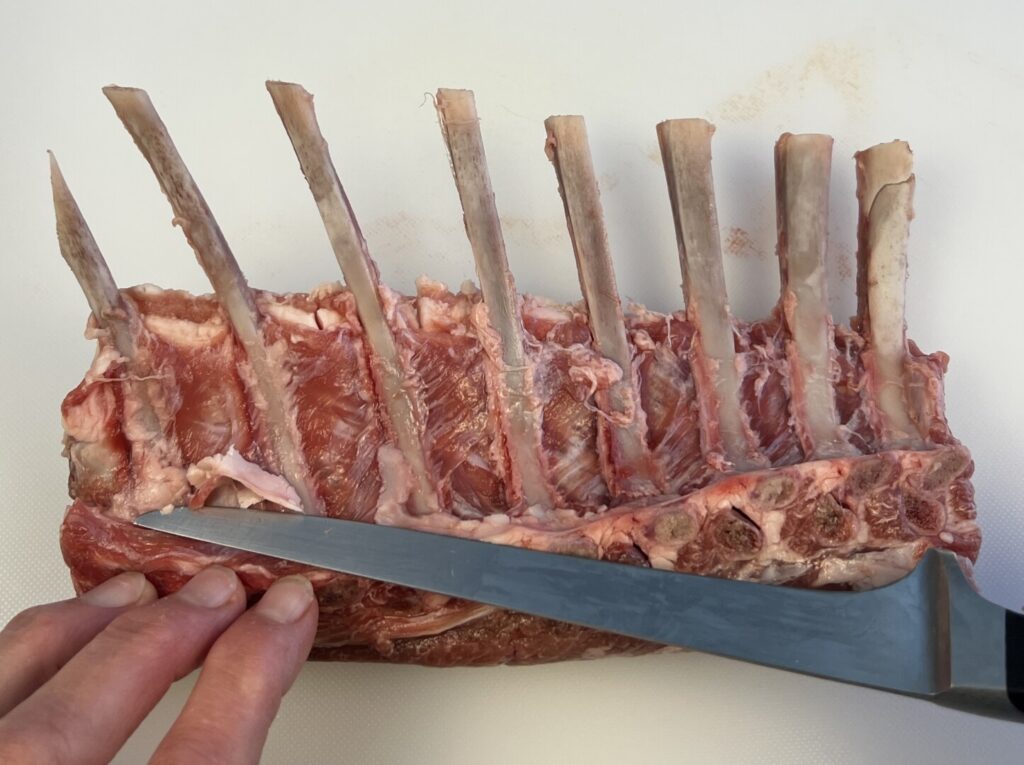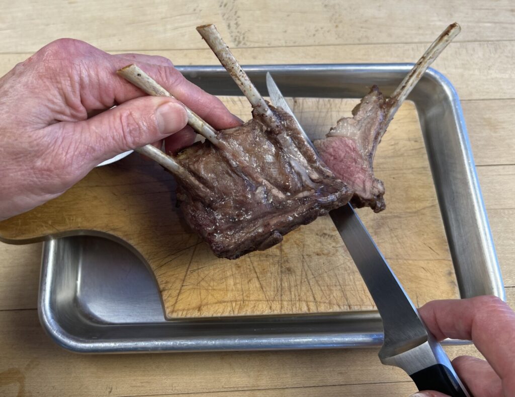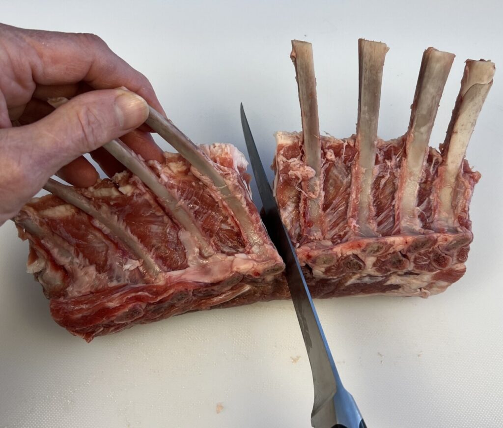 - Position each rack so that the bone side is facing you. Cut between the bones to make 4 chops per person.
