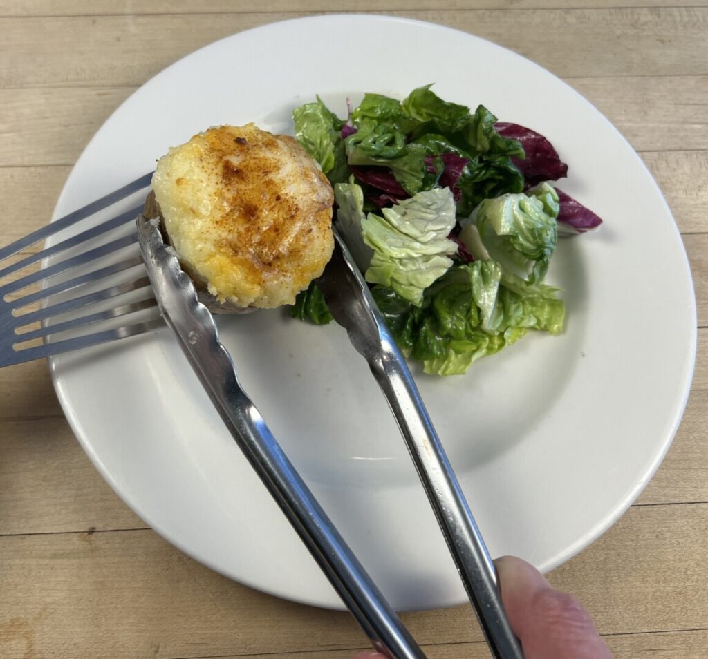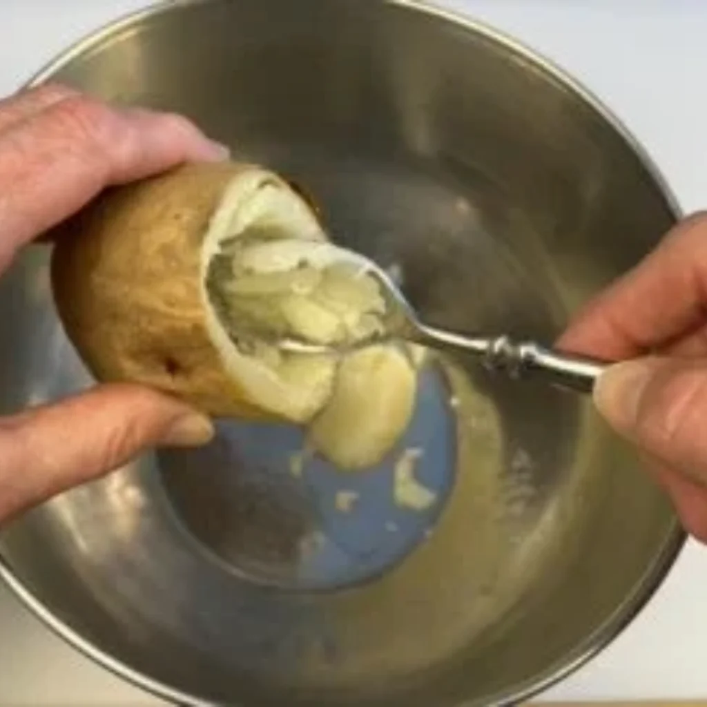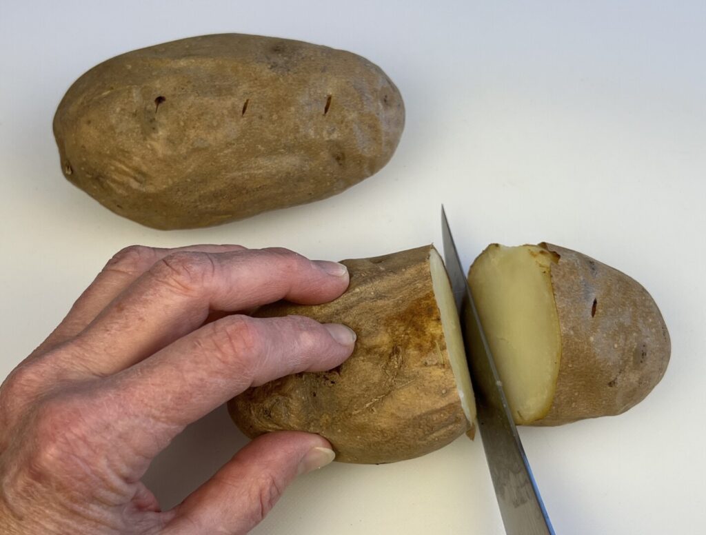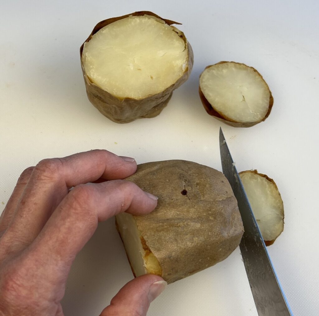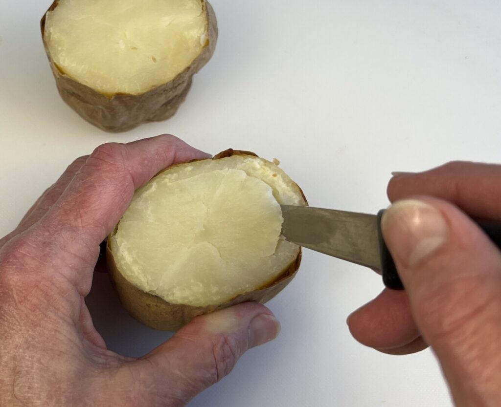 Although we typically focus first on the protein, your actual first step is to start the twice-baked potatoes (and the roasted beets), because they’ll need lengthy time in the oven. To achieve the right portion size, use medium-size russets. (If only large, long potatoes are available, you can use just one and split it in half.) Russet potatoes are a type of “mealy” potato, high in starch and low in moisture. This makes them a good candidate for making a light, fluffy purée. Make sure to scrub the skins thoroughly, because you’ll likely want to eat the delicious twice-baked skins as well as the filling. Poking holes in the skins allows steam to escape, making the interior flesh lighter and fluffier. Once the potatoes are baked, it’s important to make the whipped potato stuffing while they’re still warm. (If you get interrupted, you can reheat them gently in a microwave oven.) Cut off 1/3 of the potato tops, and shave off just a bit of the bottoms so that the potatoes will sit upright. Start hollowing by cutting a neat rim around the top opening, and then scoop out the flesh, leaving a thin but sturdy shell.