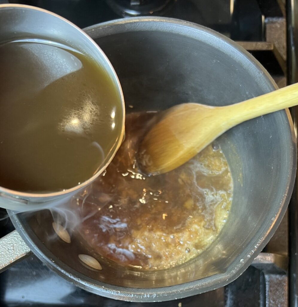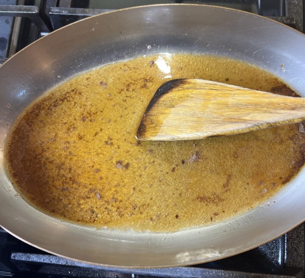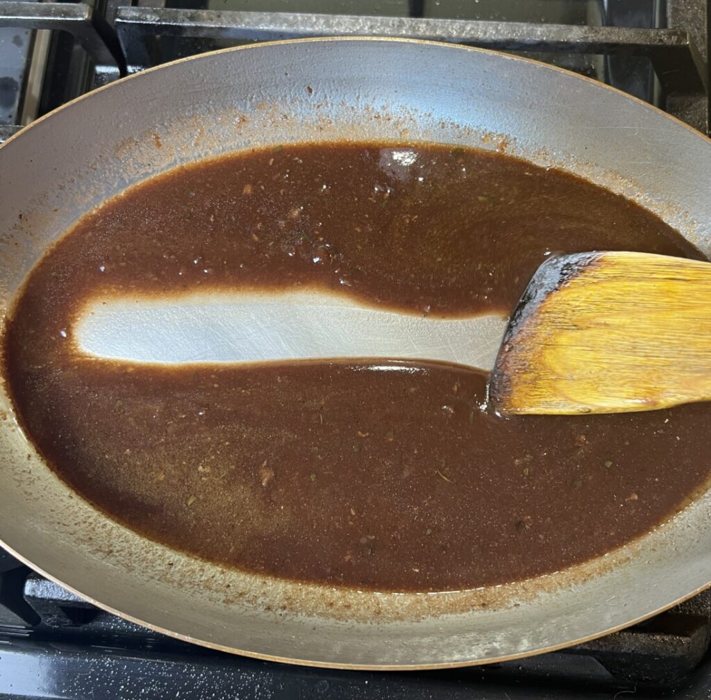 - Pour the sauce and optional demi-glace into the roasting pan and reheat it.