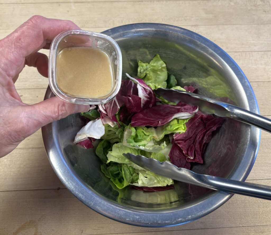 - Tear the radicchio and lettuce into a bowl and drizzle some of the vinaigrette on top.